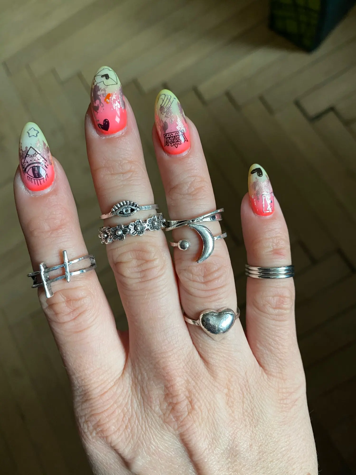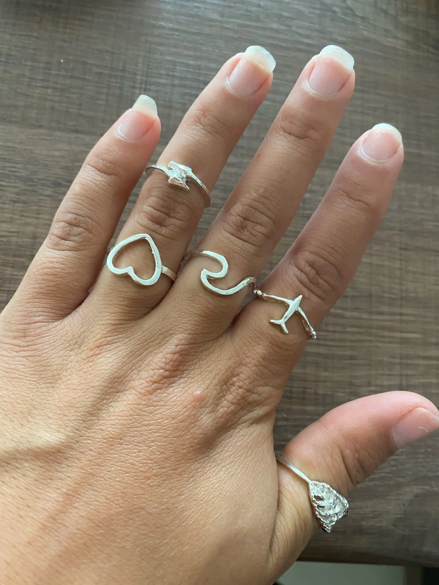 Тут то же корявенькое качество... Но цвет как и есть.. Под серебро... Штучки три четыре для фотосессий можно отобрать... Но сердечко значительно меньше... И # решеточка не на размер фаланги...даже меньше сантиметра....