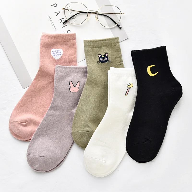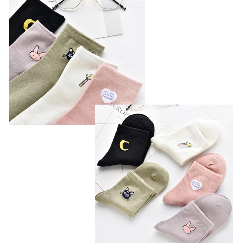 Женские хлопковые носки в Корейском стиле Q, дышащие однотонные носки в стиле Харадзюку с изображением милого кота, Луны, средней длины