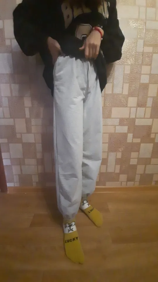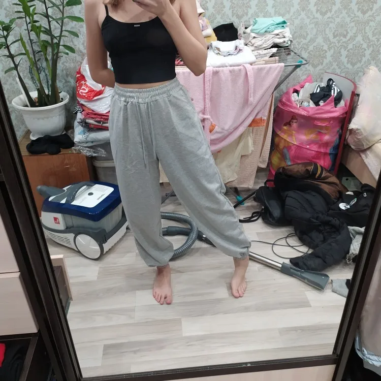 Обычно ношу S, тут для оверсайза взяла XL - именно то, чего хотела: широкие, немного не достают до щиколоток (рост 167,5 см). Ткань тонкая, но не просвечивает, легкая настолько, что в них жарко не будет, цену полностью окупают