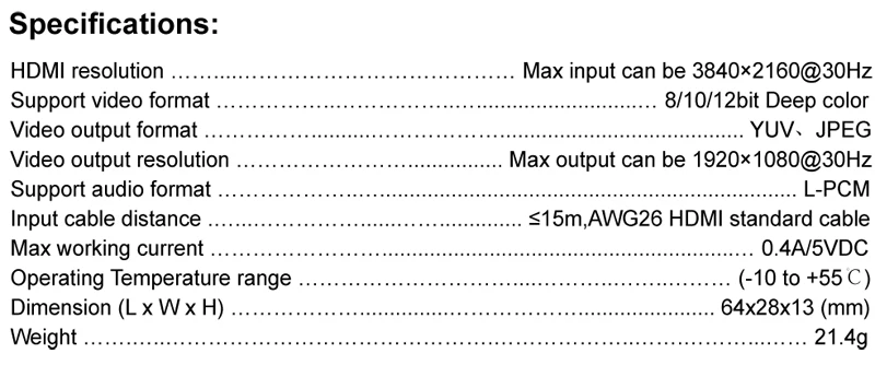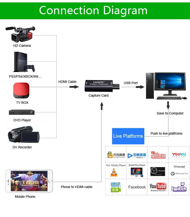 Эта карта сбора USB 2,0 может одновременно записывать как HDMI видео, так и HDMI аудио.Он может передавать аудио и видео сигналы на компьютеры и смартфоны для предварительного просмотра и хранения.Подходит для получения HD, обучения записи, медицинского изображения и т. Д.Особенности:1. Поддержка максимального входного разрешения 3840x2160 @ 30 Гц;2. Поддерживает максимальное выходное разрешение 1920x1080 @ 30 Гц;3. Поддержка 8/10/12 бит глубина цвета;4. Когда используется стандартный кабель AWG26, Расстояние входной передачи составляет до 15 м (разрешение 1080P и ниже);5. Поддержка большинства программ для приобретения, таких как VLC, OBS, Amcap и т. д.;6. Поддержка windows, Android и Mac OS;7. Соответствует спецификации USB video UVC;8. Соответствует спецификации USB аудио UAC;9. Без внешнего источника питания, маленький и портативный.Параметры:Разрешение HDMI: до 3840x2160 @ 30 ГцВидео Формат ввода: 8 / 10 / 12 бит глубина цветаРежим видеовыхода: YUV, JPEGРазрешение видеовыхода: максимальное выходное разрешение 1920x1080 @ 30 ГцПоддержка аудио формата: L-PCMДлина входного кабеля: ≤ 15 м, стандартный кабель AWG26 HDMIМаксимальный рабочий ток: 0.4A/5VDCДиапазон рабочих температур: (от-10 до + 55 ℃)Размер: 64x28x1 3 мм/2.52x1.1x0.51inПодключение к эксплуатации:1: подключите источник сигнала UHD и входной порт HDMI для USB карты сбора с помощью одной линии HDMI2: Подключите usb-разъем для USB карты сбора в usb-порт компьютера3: шаги по сборке (OBS): Откройте программное обеспечение-добавьте новый источник-выберите «устройство видеозахвата»-Установите размер экрана-выберите «режим студии» (двойное окно)-Нажмите «начать запись»Требования к конфигурации компьютерного оборудования:Процессор: ПК i5-3400 или выше; NB i7-3537u 2,0 ГГц или вышеКарта дисплея: ПК NVIDIA GT630 или выше; NC NVIDIA GT735M или вышеПамять: 4G RAMПримечание:В связи с различиями мониторов и эффектами освещения реальный цвет товара может немного отличаться от цвета на фотографиях. Спасибо!Возможны отклонения в 1-3 мм вследствие измерений вручную.