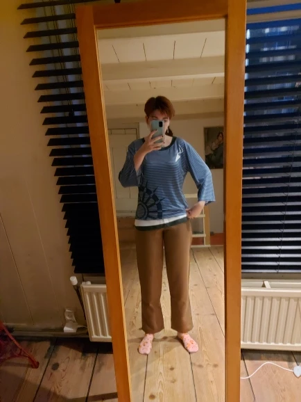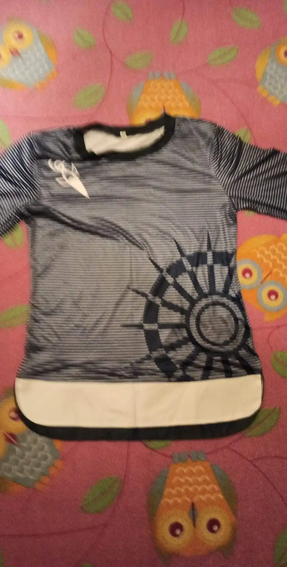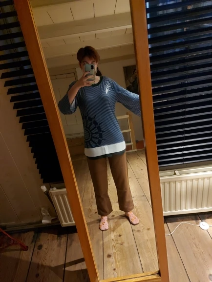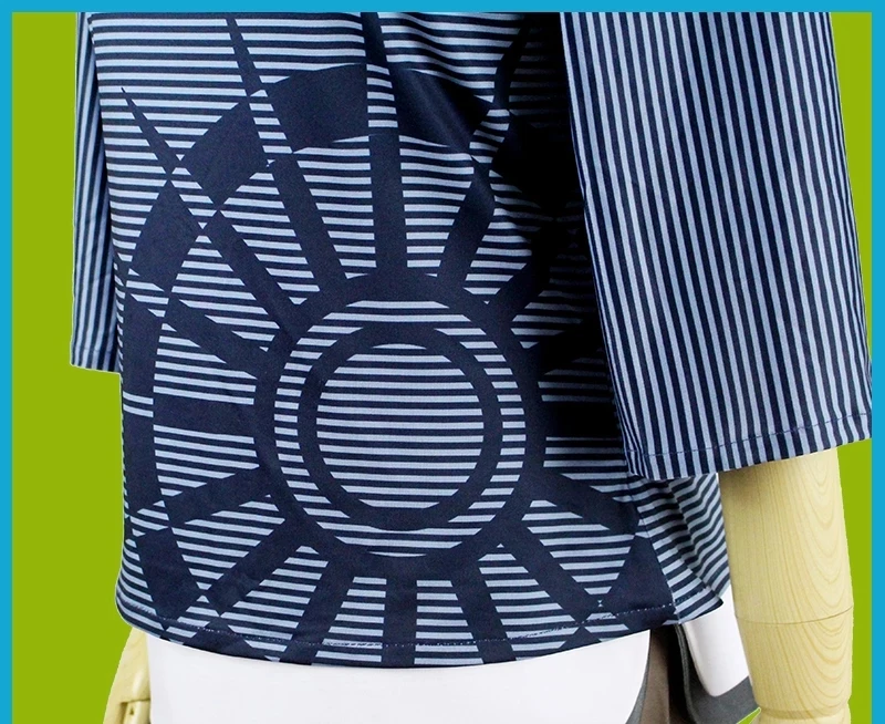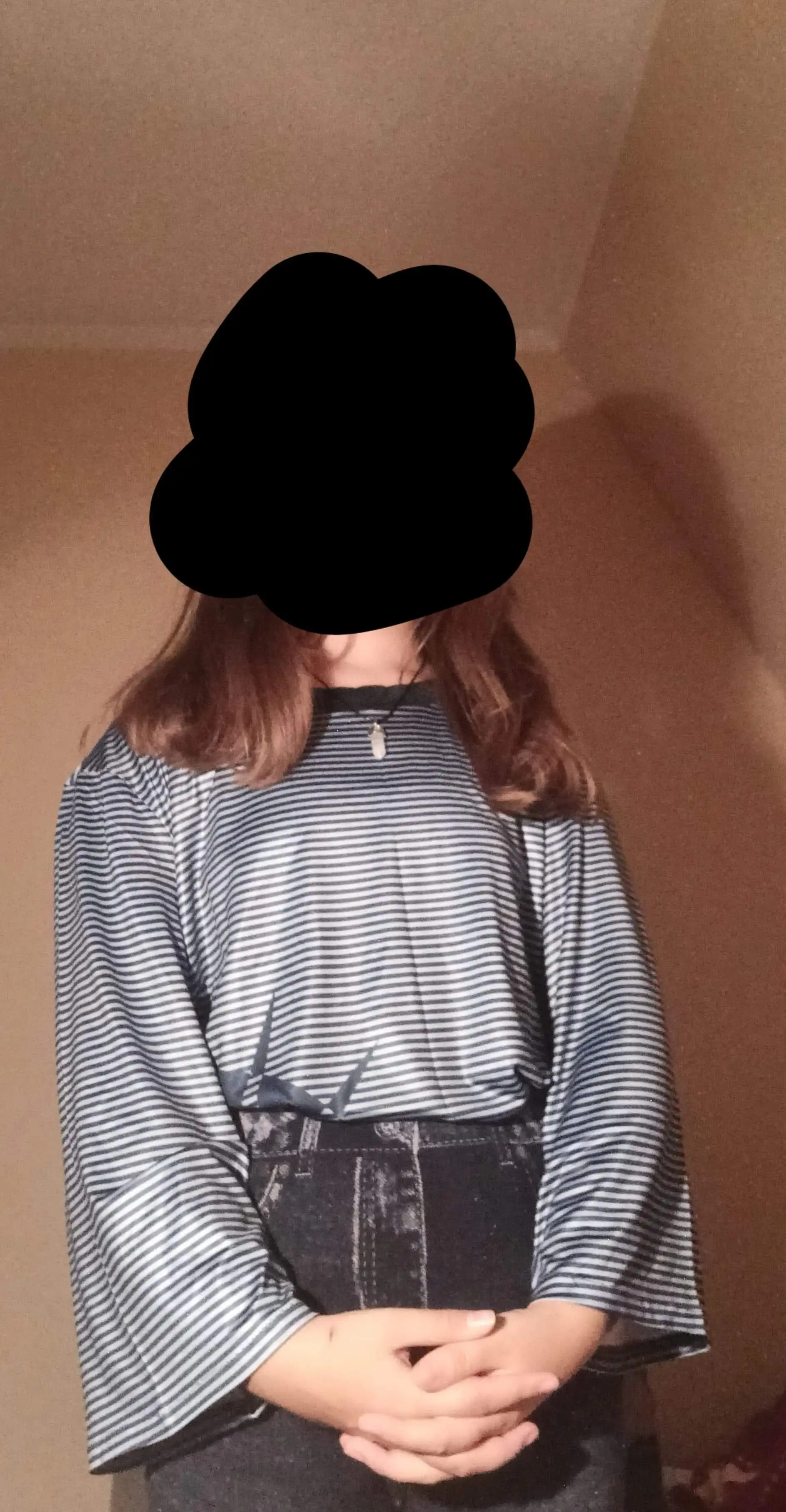 Хорошо сидит. Полосатая часть растягивается, поэтому подходит для моей груди, но нижняя часть не растягивается, поэтому не сидит на бедрах. Кроме того, металлическая часть у воротника на самом деле просто напечатана вместо отдельной части.