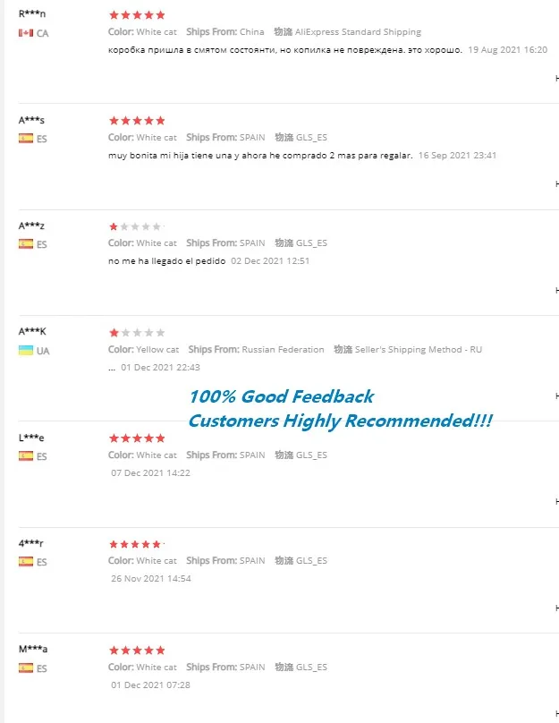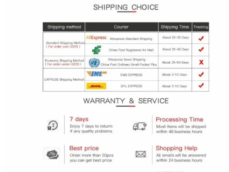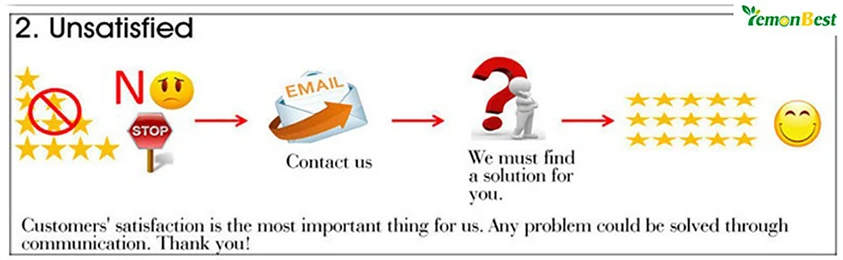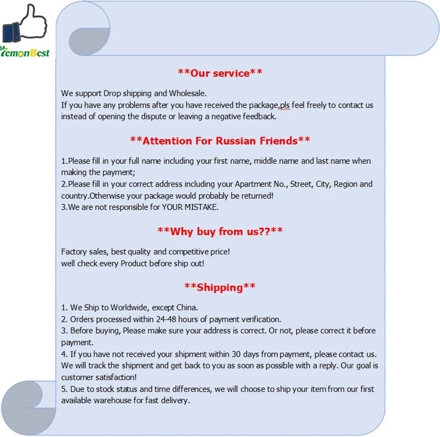 1. Пожалуйста, проверьте посылка и товар, когда вы получите тщательно, чтобы убедиться, что нет проблем.2. Если у вас есть какие-либо проблемы или вы не полностью удовлетворены своей посылка, пожалуйста, не стесняйтесь связаться с нами, прежде чем оставлять негативные отзывы. Мы решим проблему, чтобы удовлетворить вас.3. Если нет проблем, пожалуйста, оставьте нам положительный отзывы 5 звезд.
