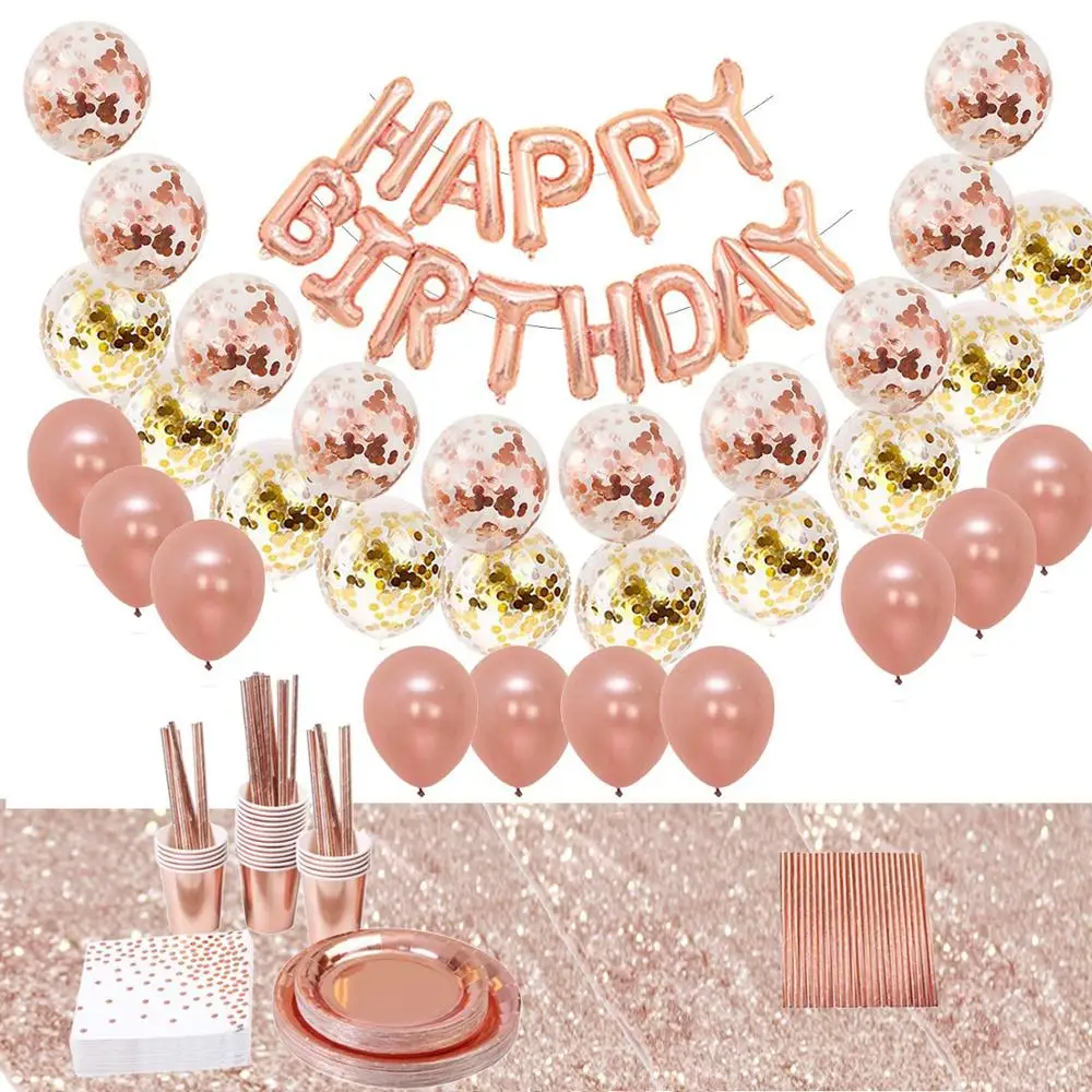 104 шт., вечерние наборы посуды из розового золота, одноразовые тарелки, чашки, бумажные салфетки, соломенные воздушные шары, настольный бегун для свадебного детского шоу