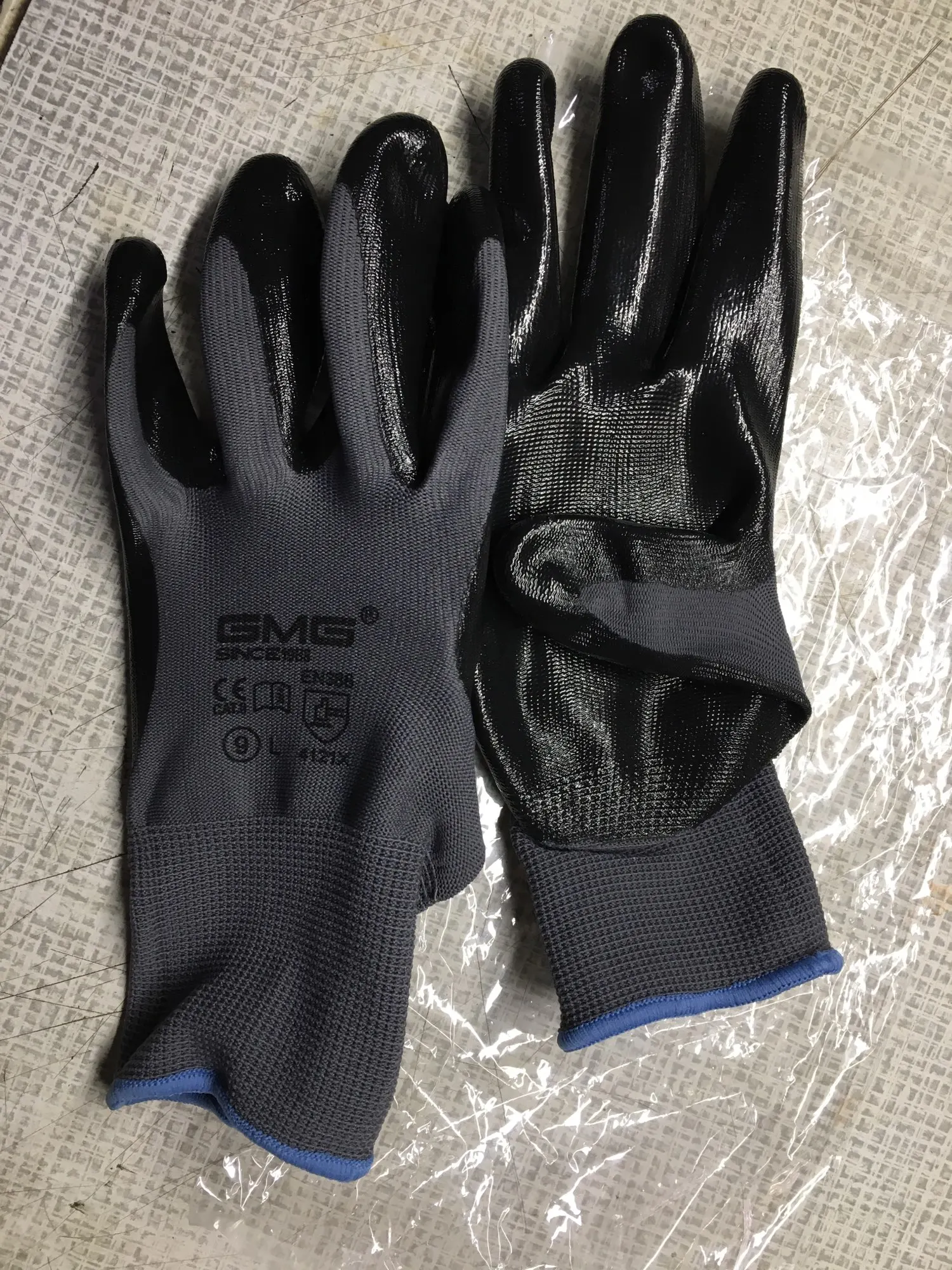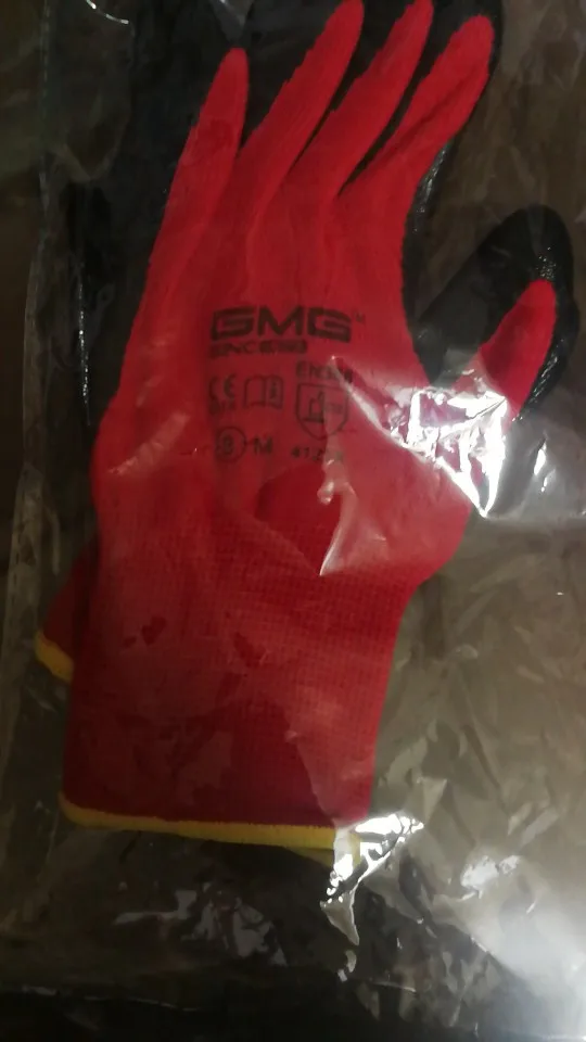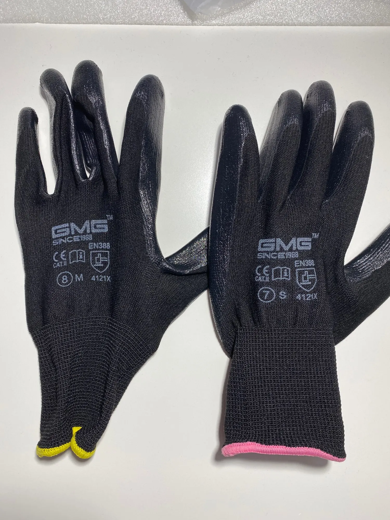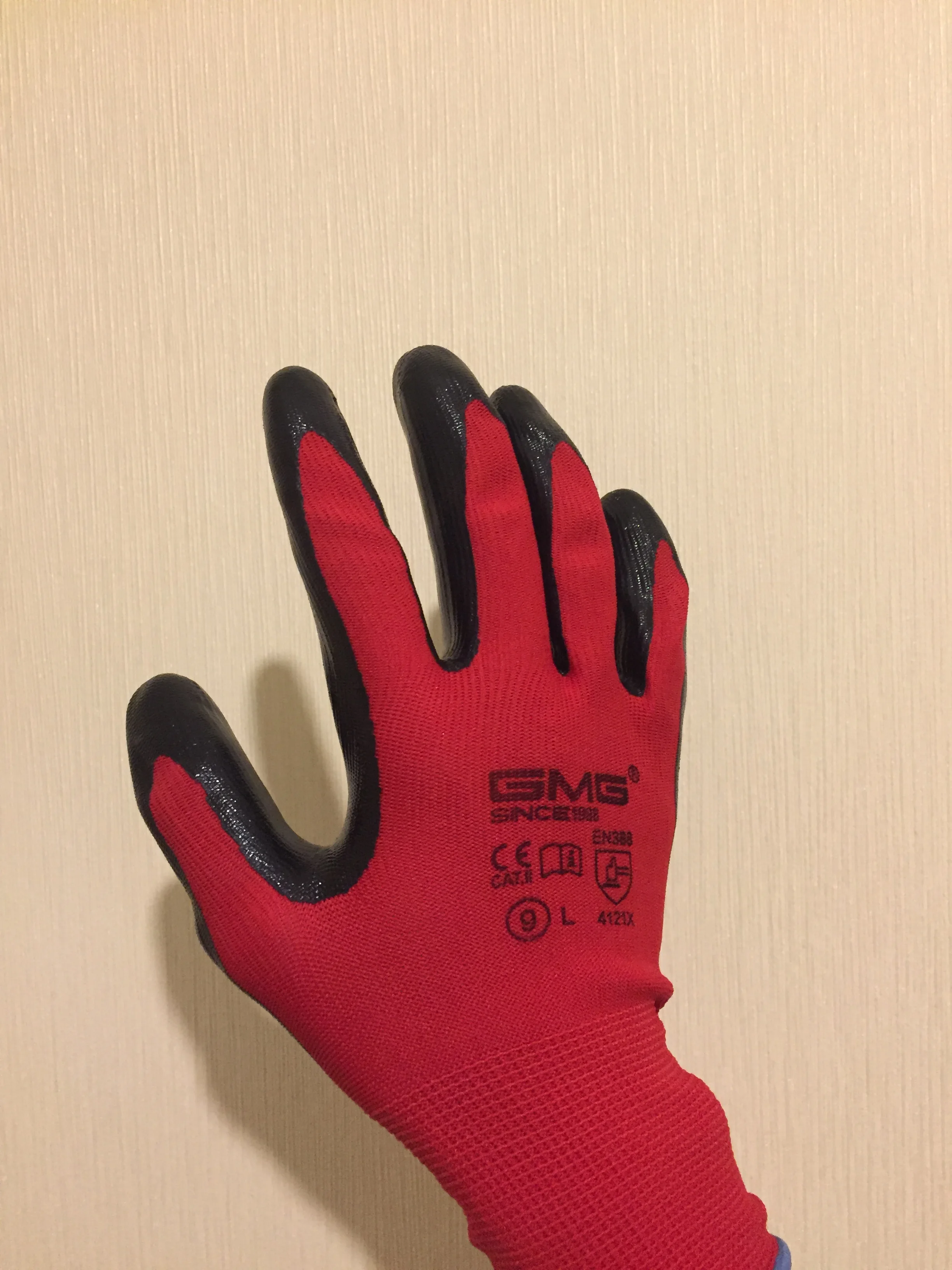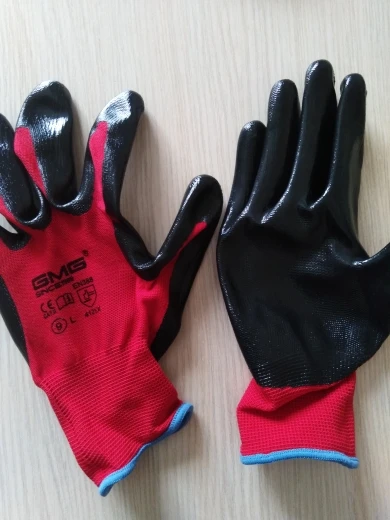 Горячая Распродажа рабочие перчатки GMG CE EN388, красный полиэстер, черный, гладкий Нитриловый защитные маслостойкие перчатки, 6 пар