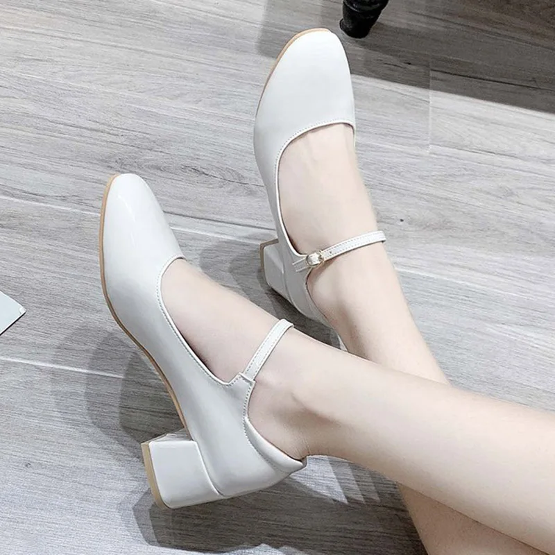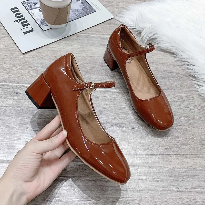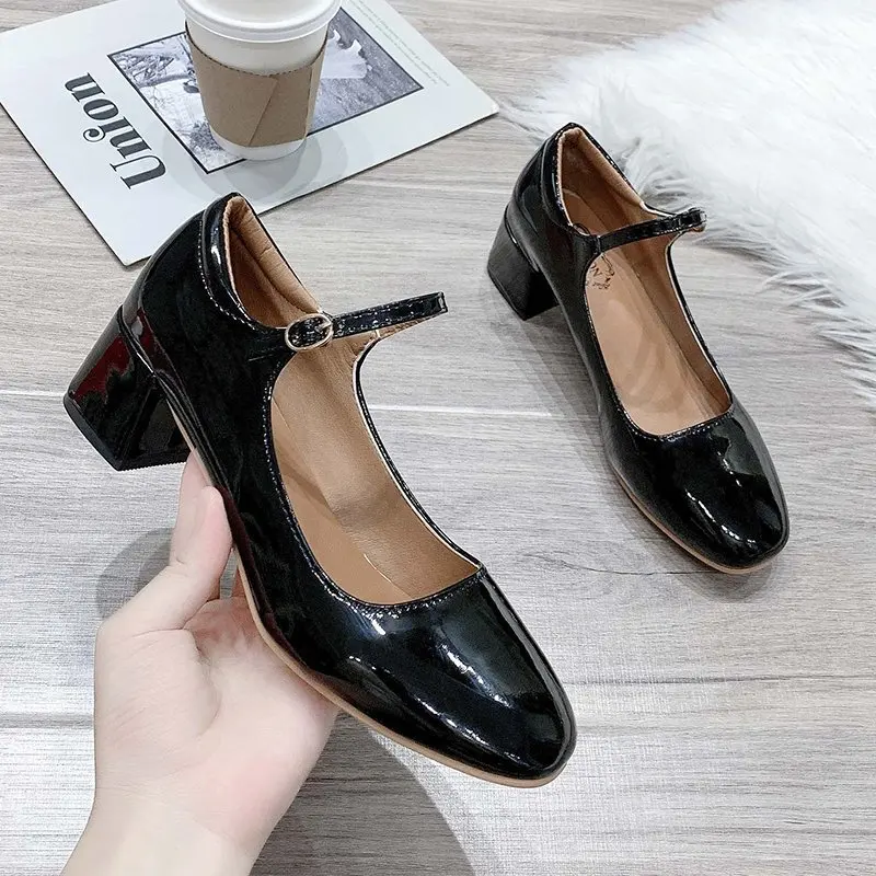 Туфли женские из лакированной кожи, на среднем каблуке, с ремешком с пряжкой, черные, модель 8434N, осень 2020
