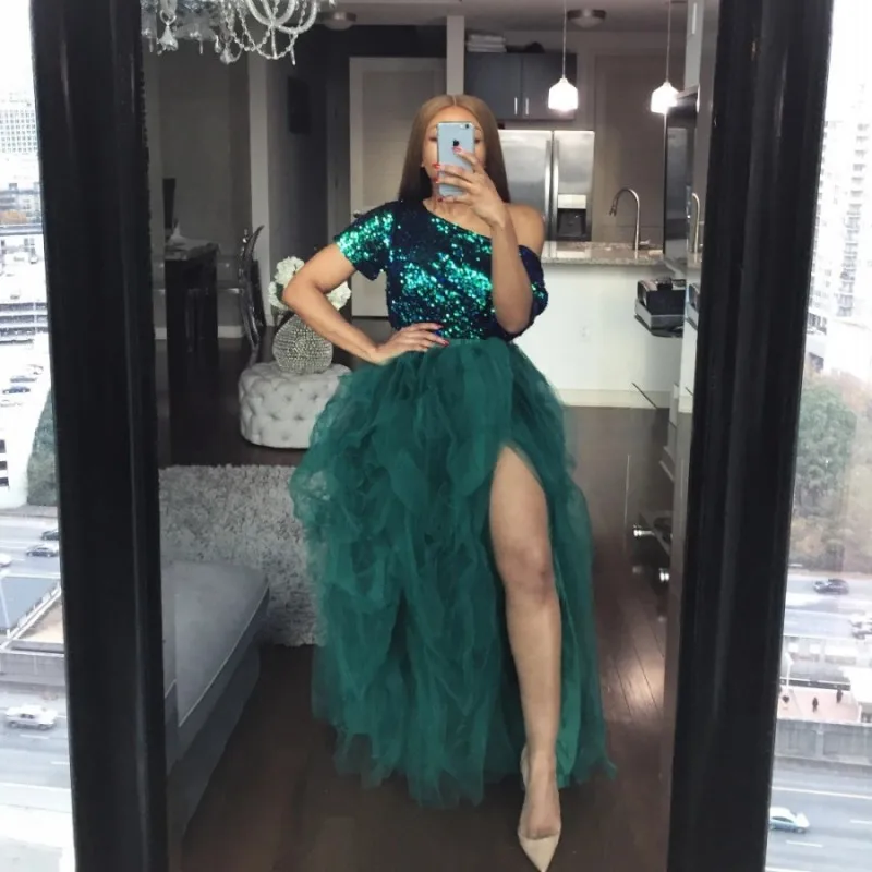 Женская фатиновая юбка с разрезом, длинная юбка-пачка изумрудно-зеленого цвета, индивидуальный пошив, 2020