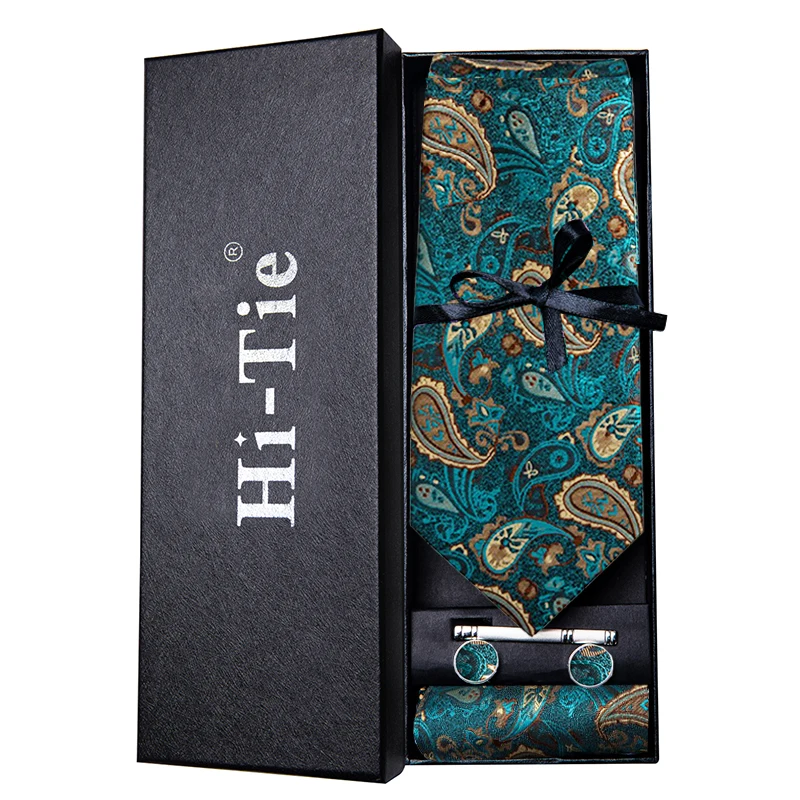 Hi-Tie Роскошная Подарочная коробка классический темно-зеленый галстук Пейсли нежный мужской галстук запонки для рук набор галстука для мужчин Свадебный высококачественный