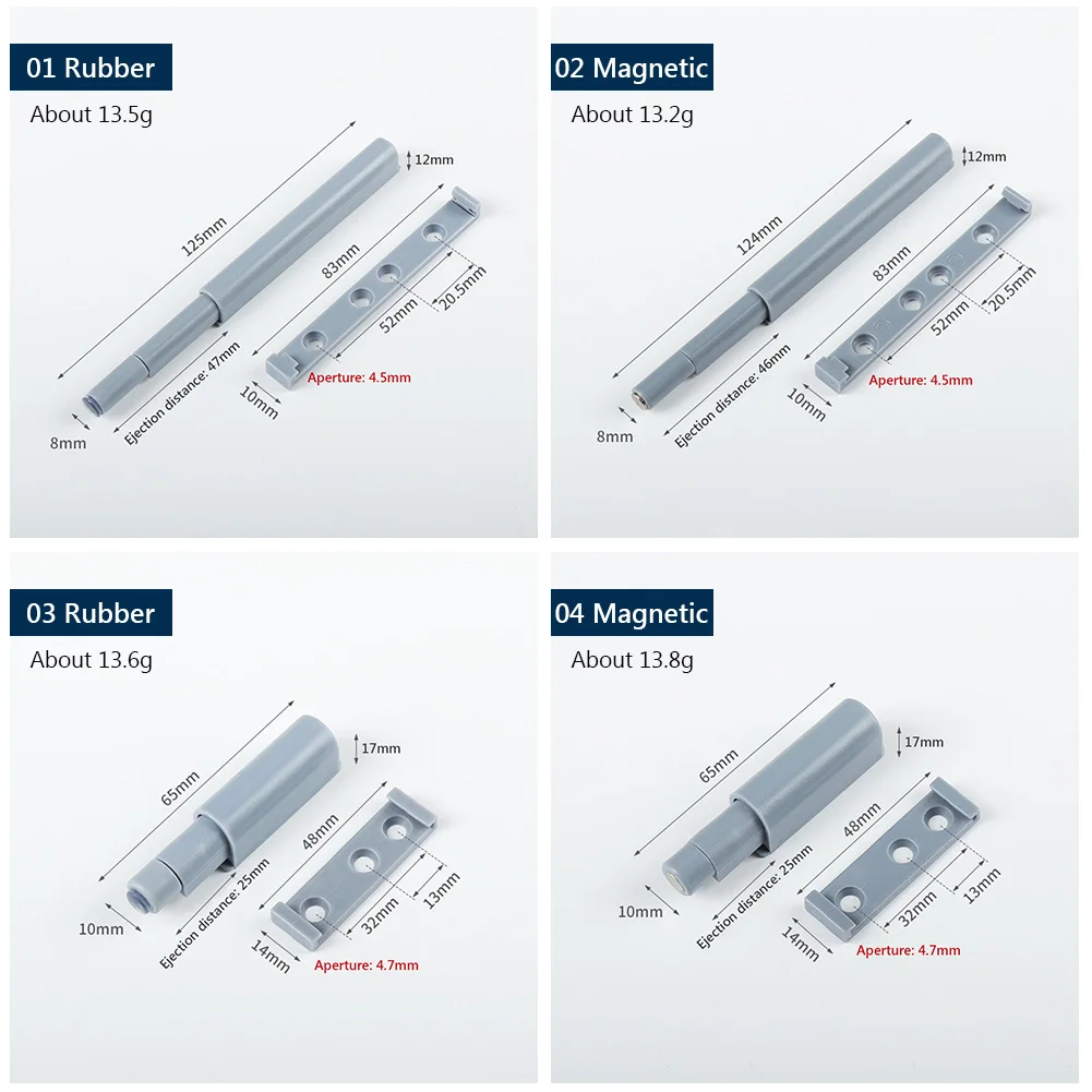 Ребаундер имеет магнитную/резиновую головку на одном конце. Магнитная головка rebounder позволяет шкафу достичь хорошего эффекта герметизации.Резиновый наконечник буфера защищает ваши двери от захлопывания, уменьшает шум, когда вы закрываете двери и ящики.