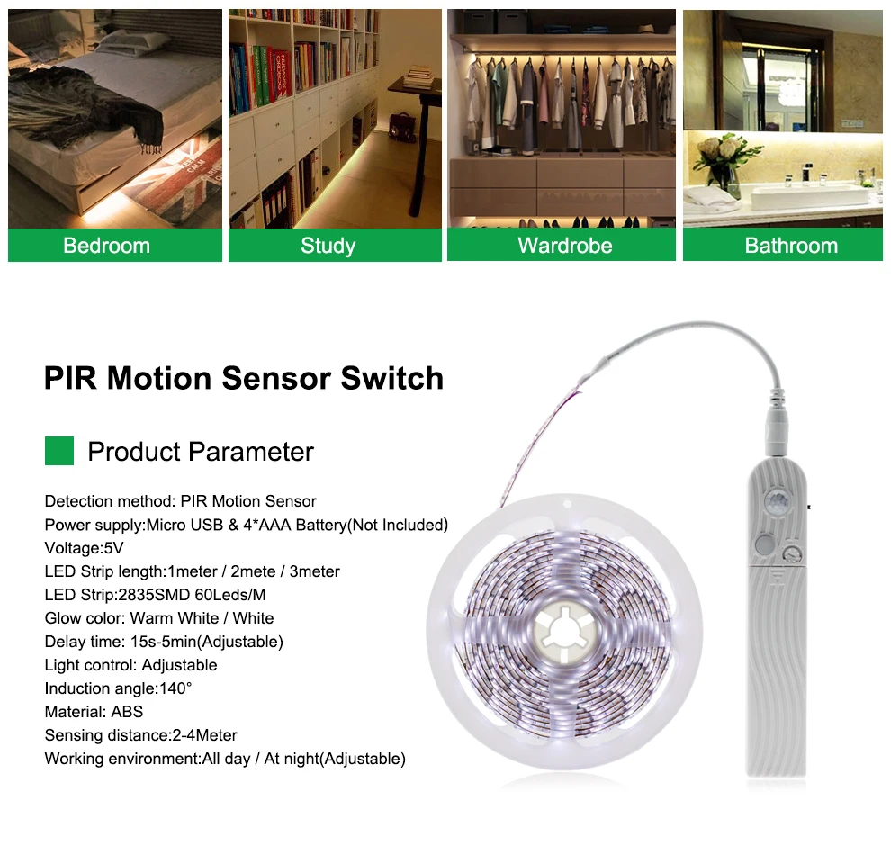 офигенная лента с датчиком движения, да ещё за такие деньги. питание от четырех мизинчиковых батареек думаю минимум на год хватит. однозначно рекомендую данную светодиодку..