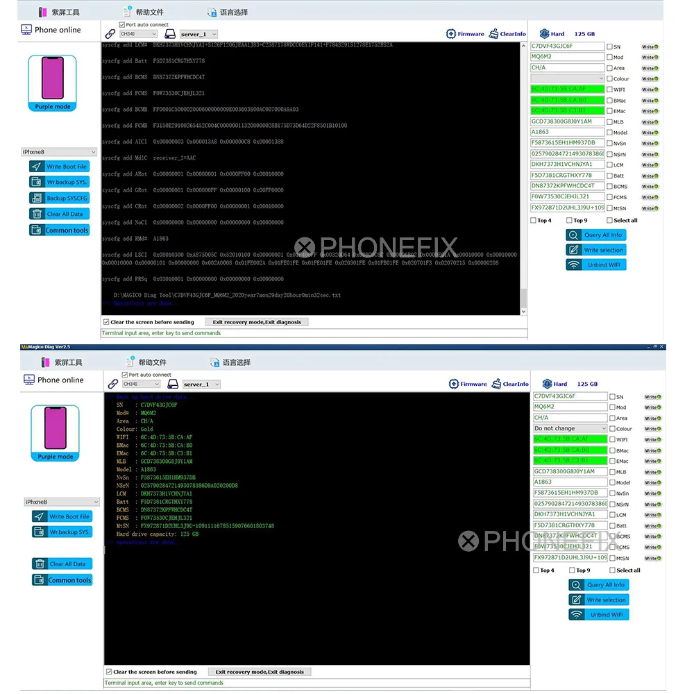 3.SE/6/6P/6S/6SP/7/7P/8/8P/X информация о сохранности или разблокировка подвижной пластины, при смене набора чипов, вы можете читать и записывать данные с помощью инструмента Magico Diag без удаления жесткого диска