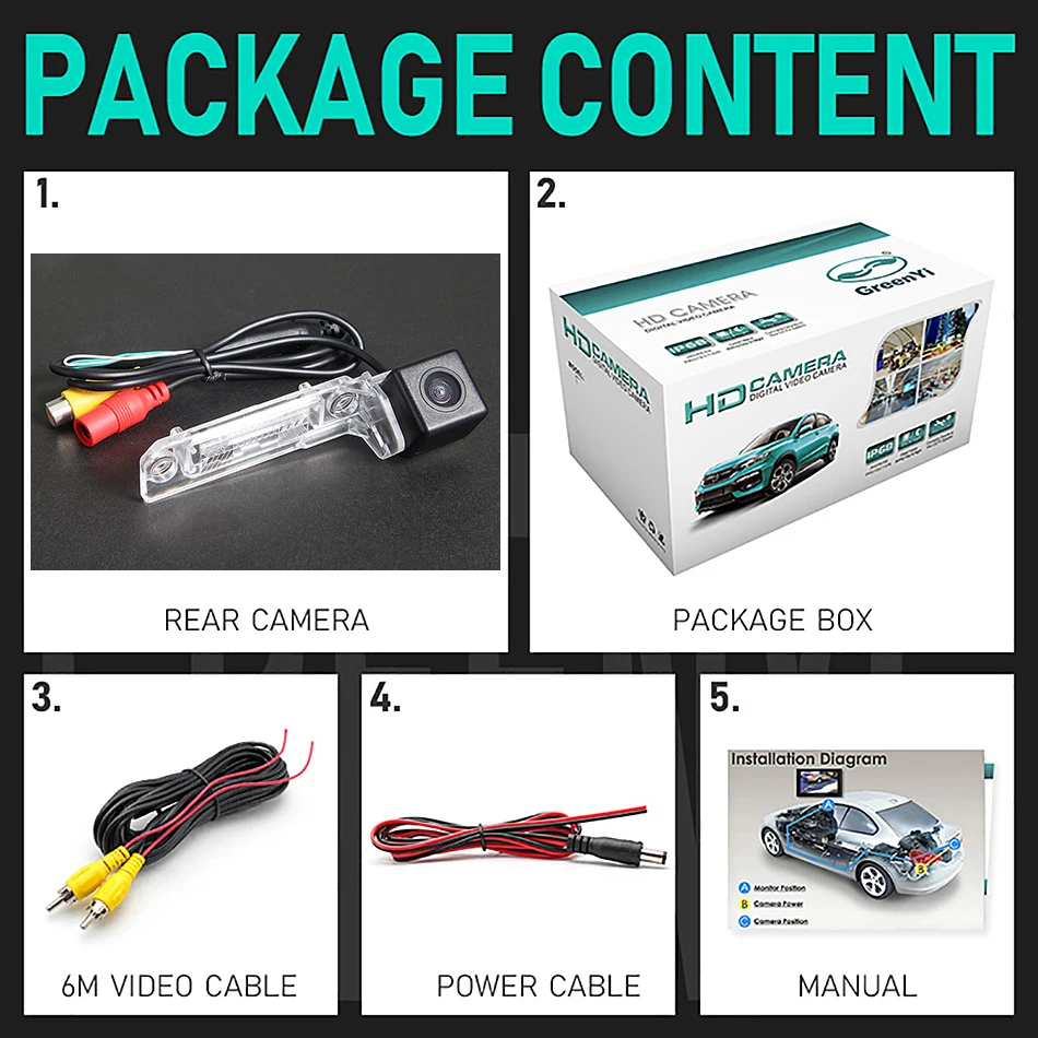 1. Камера траектории заднего вида2. Саморезы и коробка3. Видео кабель 6 м4. Кабель питания5. Руководство пользователя