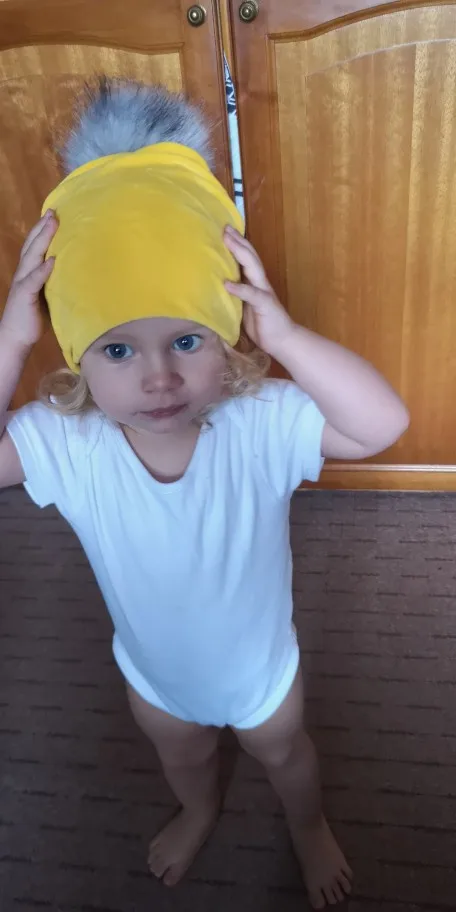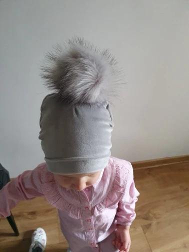 Шапочка симпатичная. Мягкая, приятная к телу. На теплую осень. Помпон пушистый, на кнопке, держится крепко, он тяжеловатый, на мой вкус. Размер подошел на 5 лет, думаю, максимум на ОГ 52.