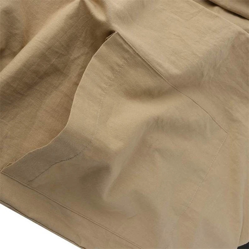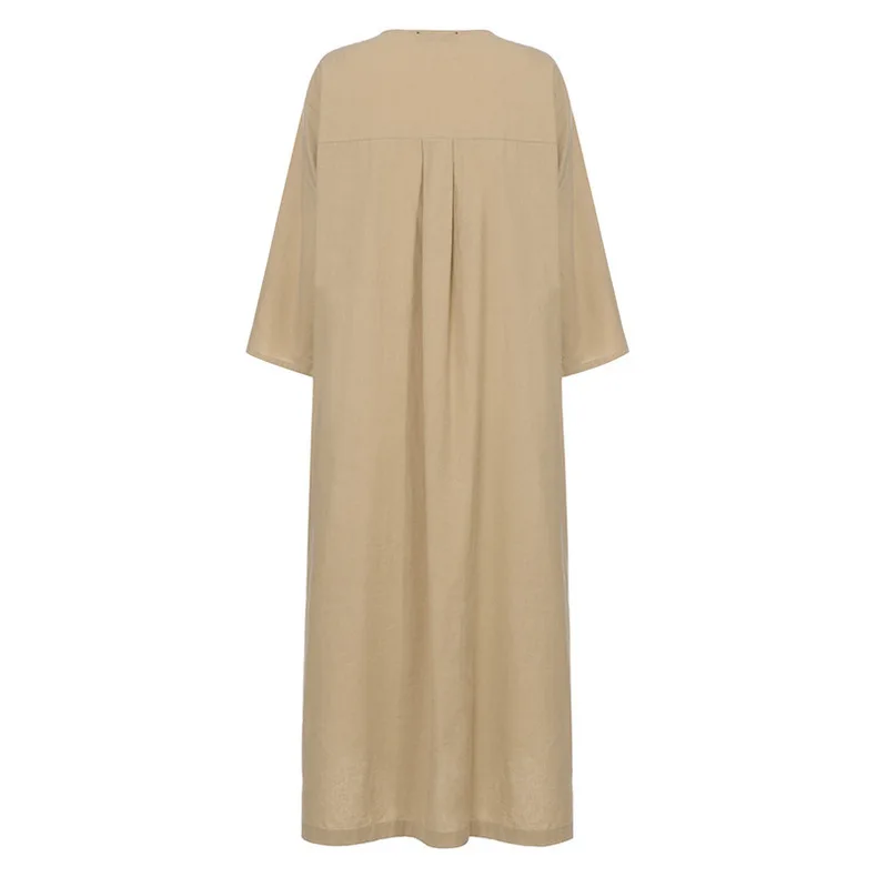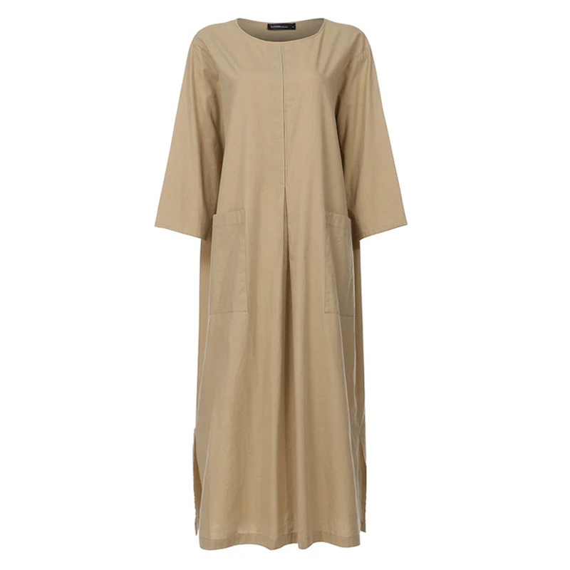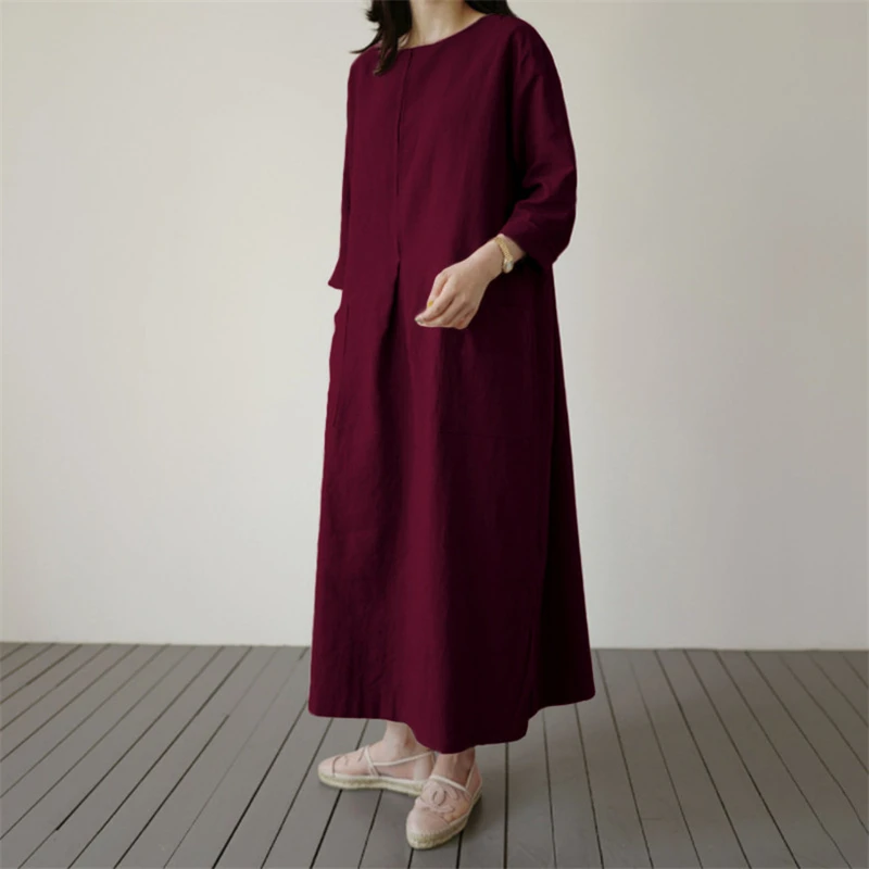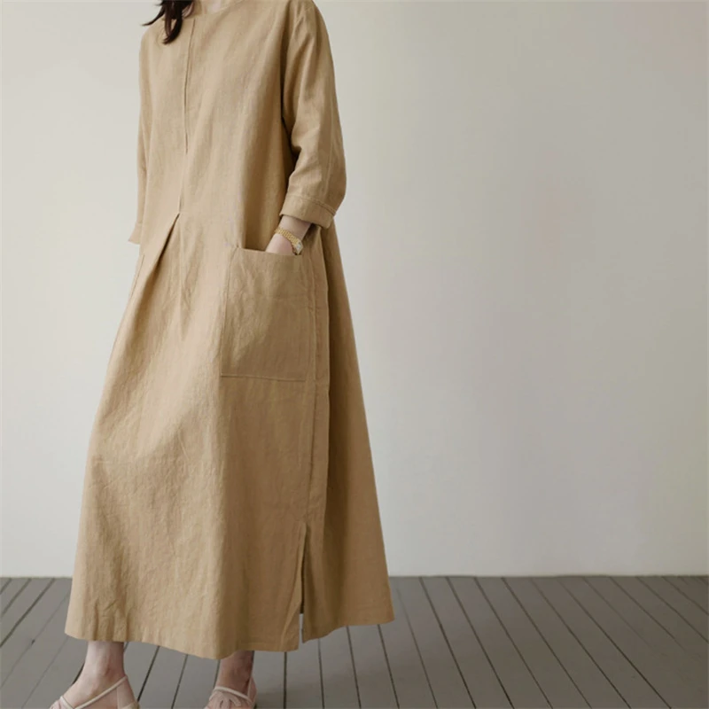 Женское длинное платье из хлопка и льна, однотонное, со складками, с карманами, весна-осень, размера плюс
