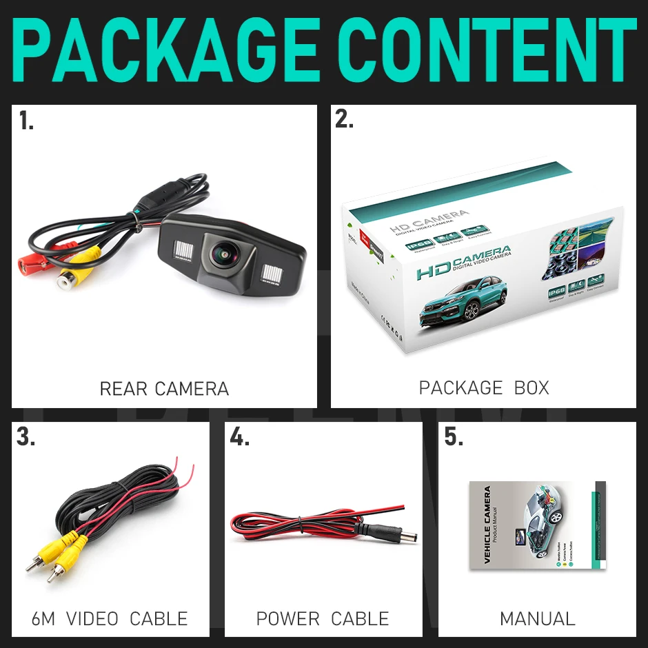 1. Камера заднего вида2 посылка вочная коробка3. Видеокабель (6 м)4. Кабель питания5. Руководство пользователя