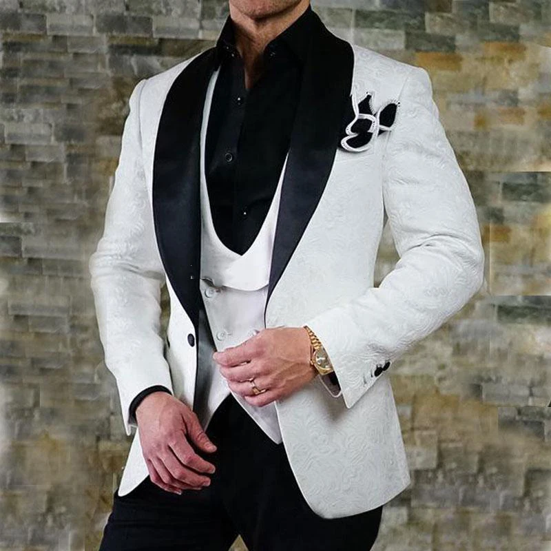 Костюм жаккардовый мужской свадебный на заказ, белый смокинг для жениха, приталенный комплект из 3 предметов (пиджак + брюки + жилет), 2020