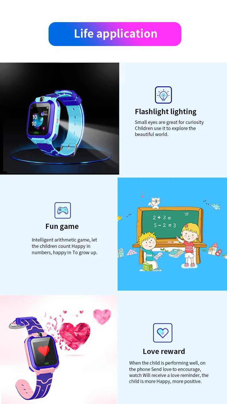 Характеристики: продуманный дизайн позволяет детям веселиться, родители могут следить за своими детьми без уведомления. Вызов SOS, удаленный мониторинг, голосовой чат, низкое излучение, цветной экран глаз, позиционирование базовой станции LBS, позиционирование Beidou (без GPS позиционирования)