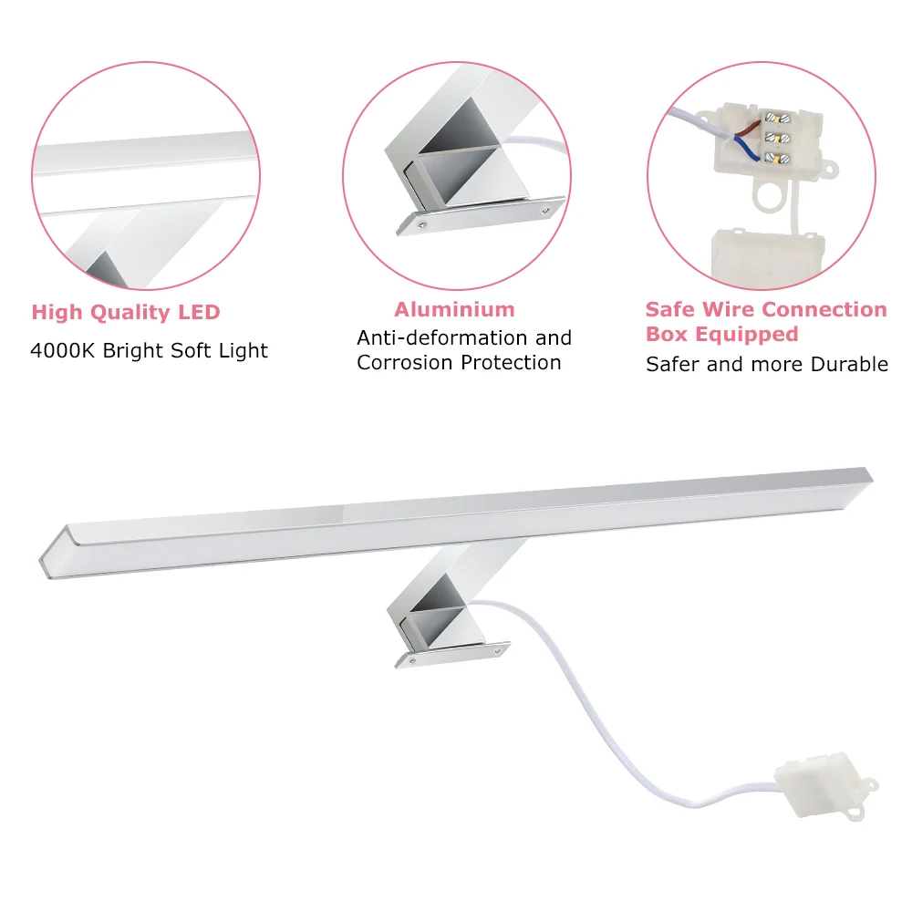 Описание:Этот светодиодный зеркальный светильник подходит для ванной, уборной, макияжного стола, гостиницы в качестве зеркального светильник. Простой и стильный дизайн демонстрирует современные и элегантные функции, идеально сочетающиеся с вашей ванной комнатой и стилем шкафа. Это незаменимая лампа.Особенности:Нейтральный светильник 4000K и 800 люмен может работать как зеркало, шкаф или освещение изображения.Равномерно распределенные светодиоды, без мерцания и антиблисветильник, защищают глаза от истощения.Сам светильник соответствует размеру 600x102x45 мм (ДхШхВ). Идеально подходит как светильник для макияжа.Два предварительно просверленных и съемных кронштейна делают установку простой и переменной на шкаф, стену и зеркало.Простой и стильный дизайн демонстрирует современные и элегантные функции, идеально сочетающиеся с вашей ванной комнатой и стилем шкафа.Оснащенная надежным кабельным разъемом, лампа легко устанавливается.Примечание: пожалуйста, выключите питание перед подключением кабеля питания к зарезервированной линии.Характеристики:Входное напряжение: 100-240 В переменного токаВходной ток: 0,1 АВходная частота: 50/60Макс. Входная мощность: 10 ВтТип светодиодный да: 2835Количество СВЕТОДИОДНЫЙ Дов: 48 шт.Световой поток: 800 лмЦвет светильник: белый (4000 к)Световой КПД: 80 лм/ВтУгол свечения: 100 °Индекс цветопередачи: >80Водонепроницаемость: IP44Рабочая температура: -20 ℃-40 ℃Температура хранения: -20 ℃-65 ℃Материал: нержавеющая сталь, поликарбонатРазмер изделия: 60,0*10,2*4,5 см/23,62*4,01 * дюймаВес изделия: 324 г/11,41 унцииПосылка: 60,5*12,1*4,8 см/23,81*4,76 * 1.89inВес посылка: 457 г/16,11 унцииПосылка тация:Светильник1 * Руководство пользователя