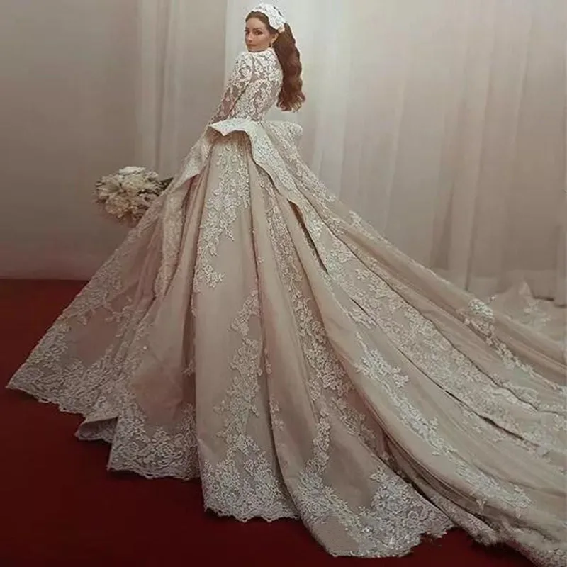 Мусульманский с высокой шеей Свадебные платья из Саудовской Аравии; Скромные свадебные платья; Изготовленные на заказ кружевные аппликации с длинным рукавом; Vestidos De Mariage