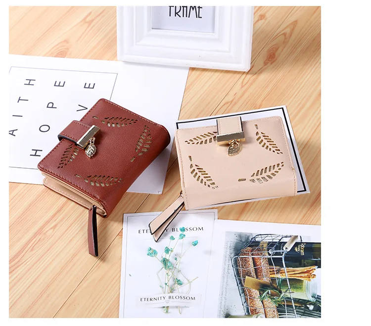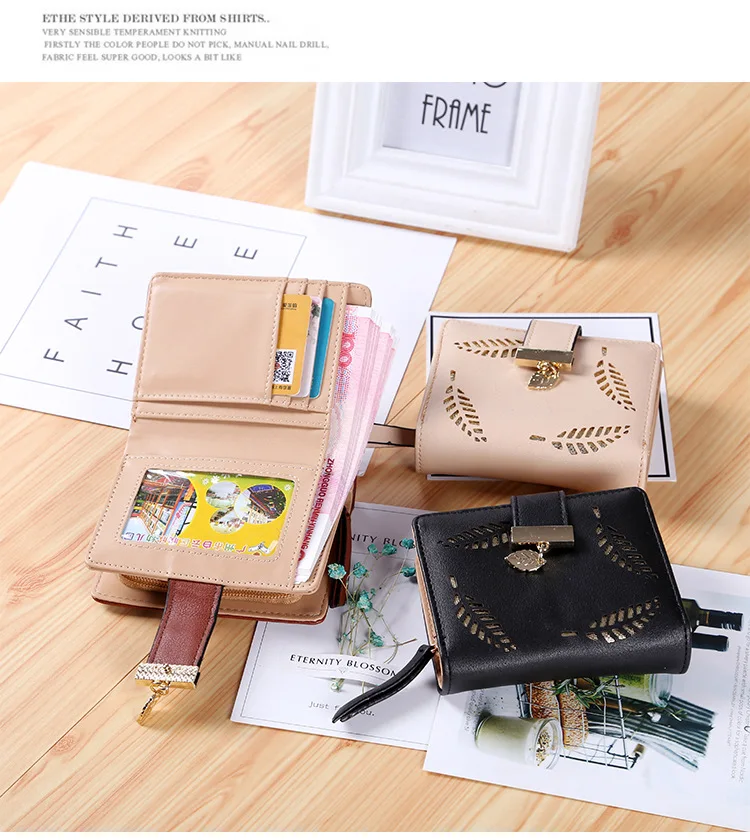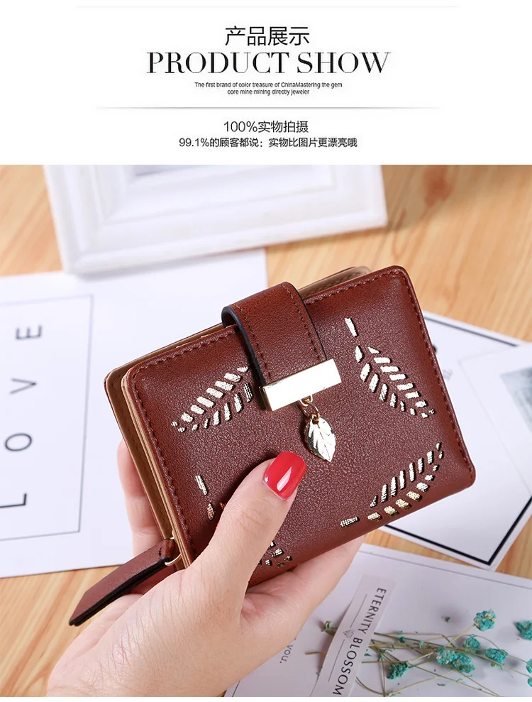 Новинка 2020, женские короткие кошельки, маленький кошелек на молнии с пряжкой и полыми листьями, кошелек из искусственной кожи, держатель для карт, Женский кошелек для монет
