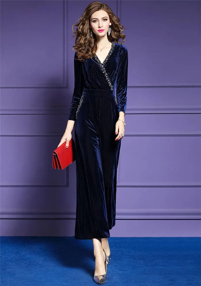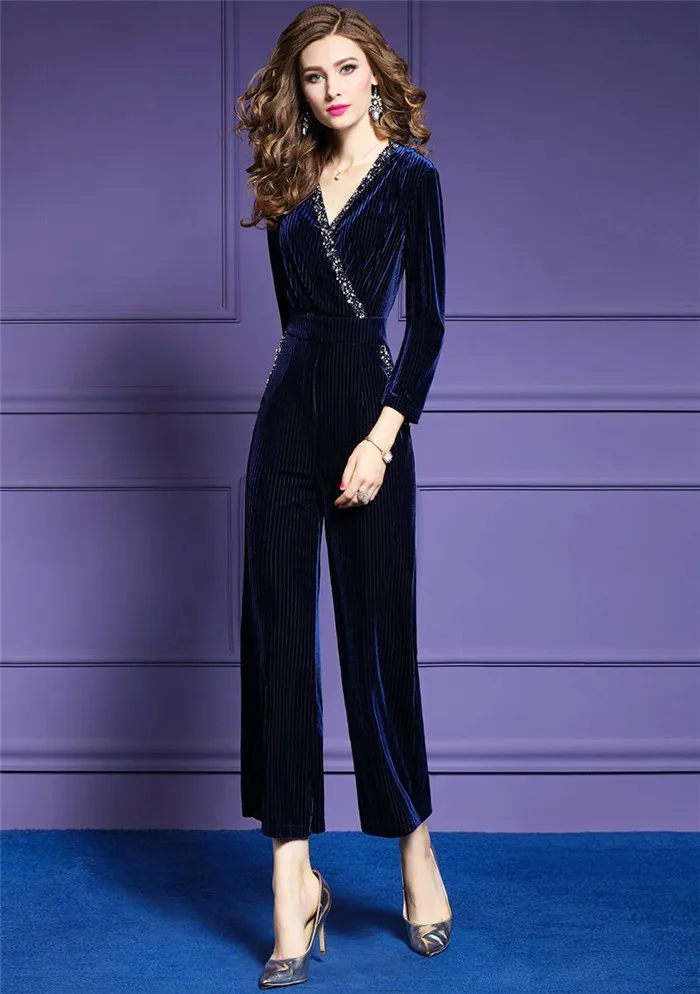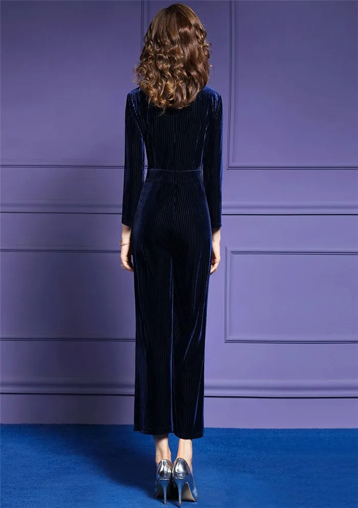 Женский бархатный комбинезон размера плюс, элегантный Осенний комбинезон для офиса с глубоким v-образным вырезом и лацканами в полоску, 2020
