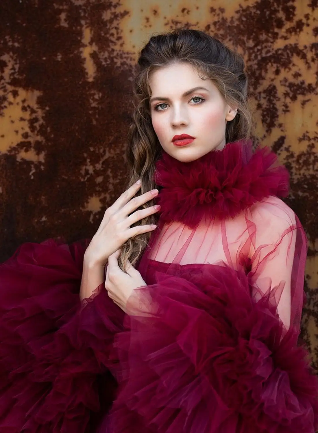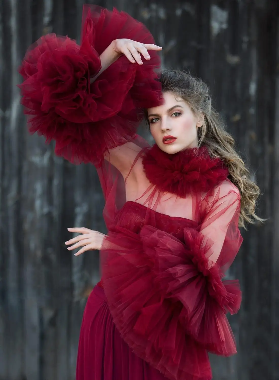 Шикарные тюлевые топы с пышным длинным рукавом и высоким воротом, пушистая Женская Сексуальная бордовая Тюлевая блузка, прозрачный тюлевый Топ, плявечерние