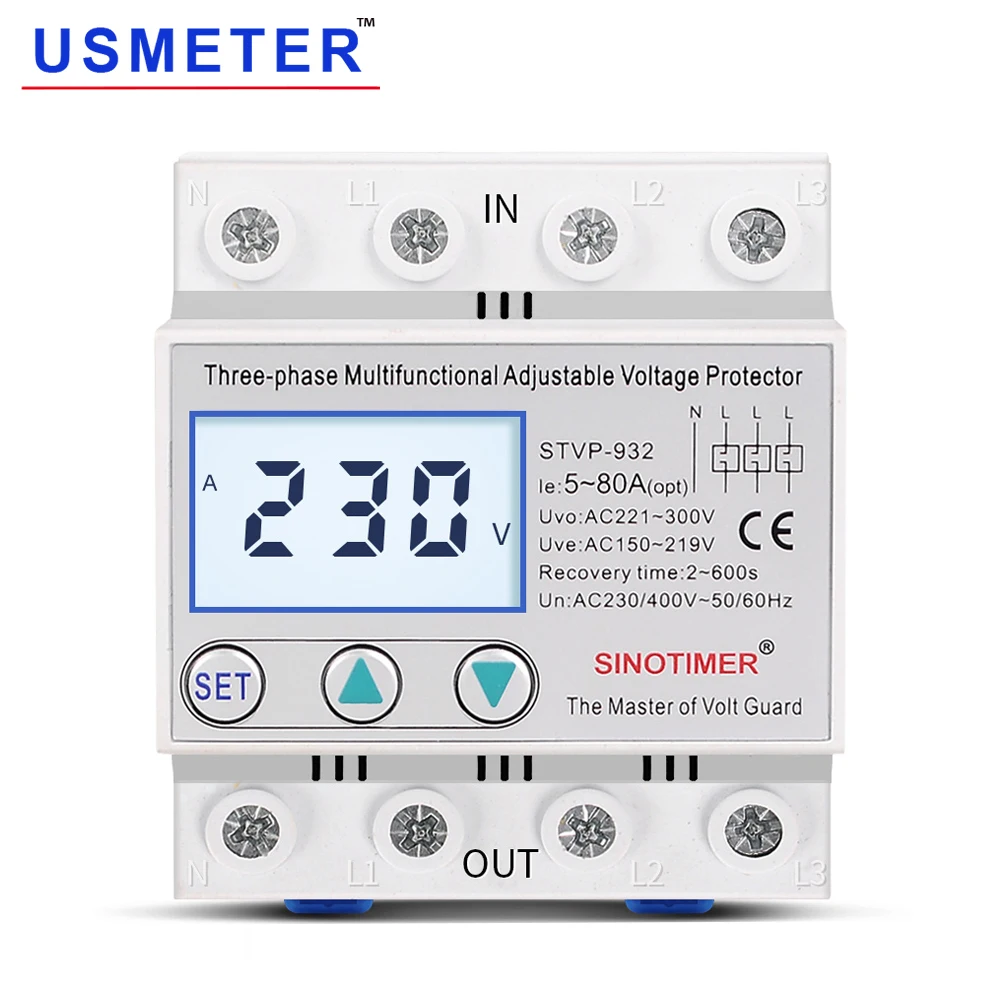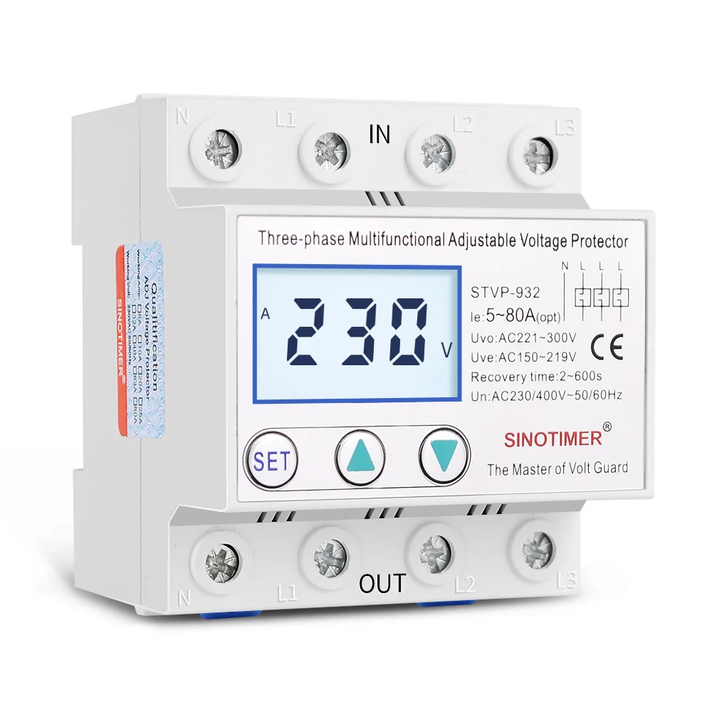 STVP серии SINOTIMER бренд автоматическая защита от перенапряжения и пониженного напряжения подходит для трёхфазного переменного тока 380 В пер. тока, 50/60 Гц, Номинальный рабочий ток 80A. Его основная особенность заключается в том, что когда цепь имеет проблемы с перенапряжением или недостаточным напряжением, продукт может мгновенно отключить источник питания, чтобы защитить электрическое оборудование от повреждения, кроме того, протектор может автоматически включать источник питания, когда напряжение цепи возвращается к нормальному.Особенности:1. Защита от перенапряжения2. Защита от низкого напряжения3. Дисплей напряжения (отдельные измерения фазы ABC Вольт)4. Трехфазная защита от разбалансировки вольт5. Защита фазовой последовательности (защита обратной фазы)6. Защита от разрыва нулевой линии7. Защита от фазового сбоя8. Защита от перенапряжения регулируемая9. Регулируемое значение восстановления перенапряжения10. Защита от перенапряжения время действия регулируется11. Регулируемое значение защиты под напряжением12. Регулируемое значение восстановления под напряжением13. Время защиты от пониженного напряжения регулируется14. 3 фазы вольт Несбалансированное защитное значение регулируемое15. 3 фазы вольт разбалансировка защита время действия регулируется16. Время задержки после включения питания регулируется17. Время задержки восстановления неисправностей регулируется18. Выбор режима сброса19. Запрос на неисправность20. Сброс заводских данныхПримечание:1. Нажмите ▲ и ▼ вместе в течение 3 секунд, это может быть сброс настройки factroy.2. После нажатия набора, если нет операции в течение 10 секунд, состояние устройства будет автоматически удалено, измененные параметры не будут сохранены.3. Защита от нулевой фазы бесполезна, когда трехфазный двигатель работает, потому что его нельзя отличить от задней части EMF.4. Когда символ ABC отображается на ЖК-экране. Пожалуйста, произвольно поверните две фазы линии (пожарная линия).5. Устройство не имеет защиты от перегрузки и короткого замыкания. Используйте его с DZ47, C65 мини-выключатели цепи и т. Д.Посылка:1. Защита напряжения STVP-932 * 12. Руководство пользователя на английском языке