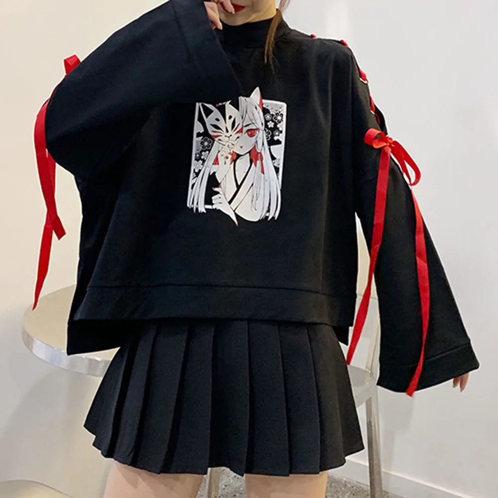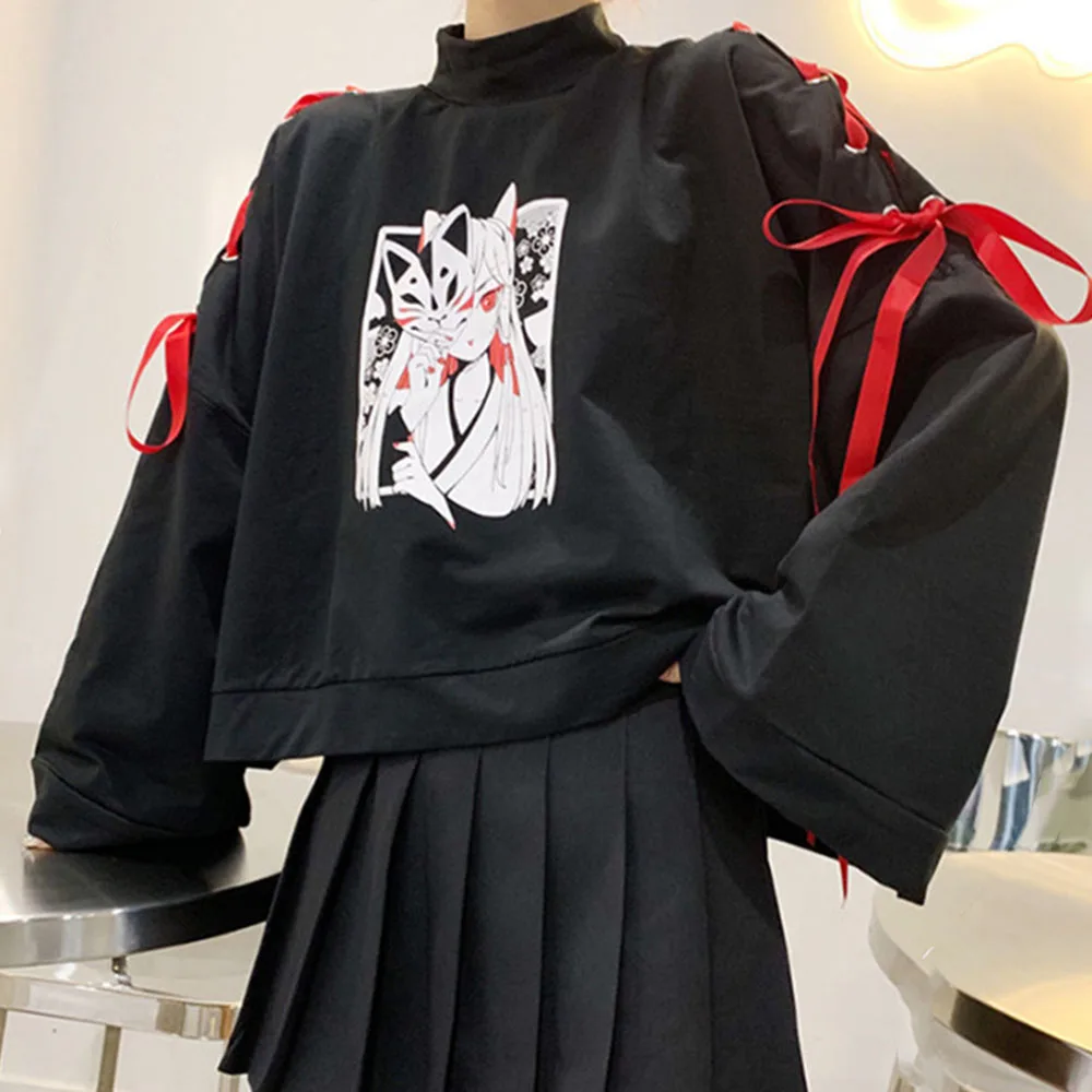 Футболка женская, с принтом аниме, лисы, ленты, с бантом, черная, д...
