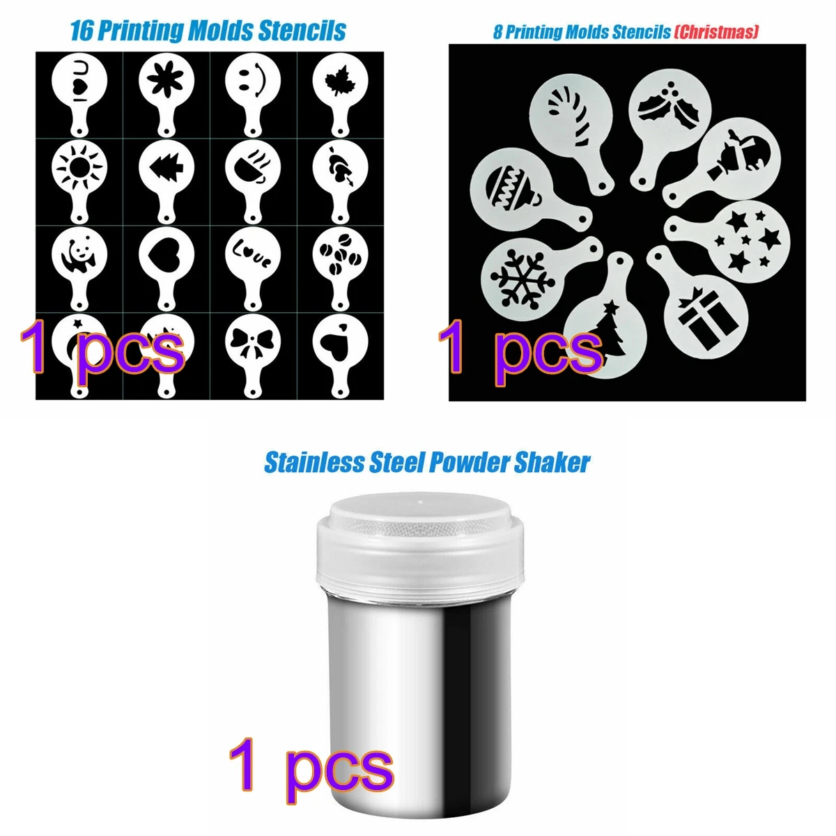 Шейкер для порошка из нержавеющей стали, кофейные какао-драги с тонкой сетчатой крышкой для выпечки приготовления пищи с 24 трафаретами для печати