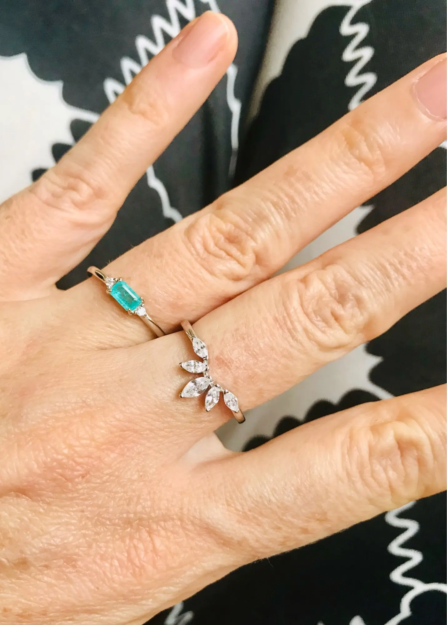 Кольцо красивое. Для примера надела с камнем покрупнее и поменьше (кольцо с голубым камнем из этого магазина, с чёрным - из моих закромов). Заказала 6 на 16-16,5 размер. Всё пришло в коробочке. В подарок положили салфетку для полировки украшений и браслет.