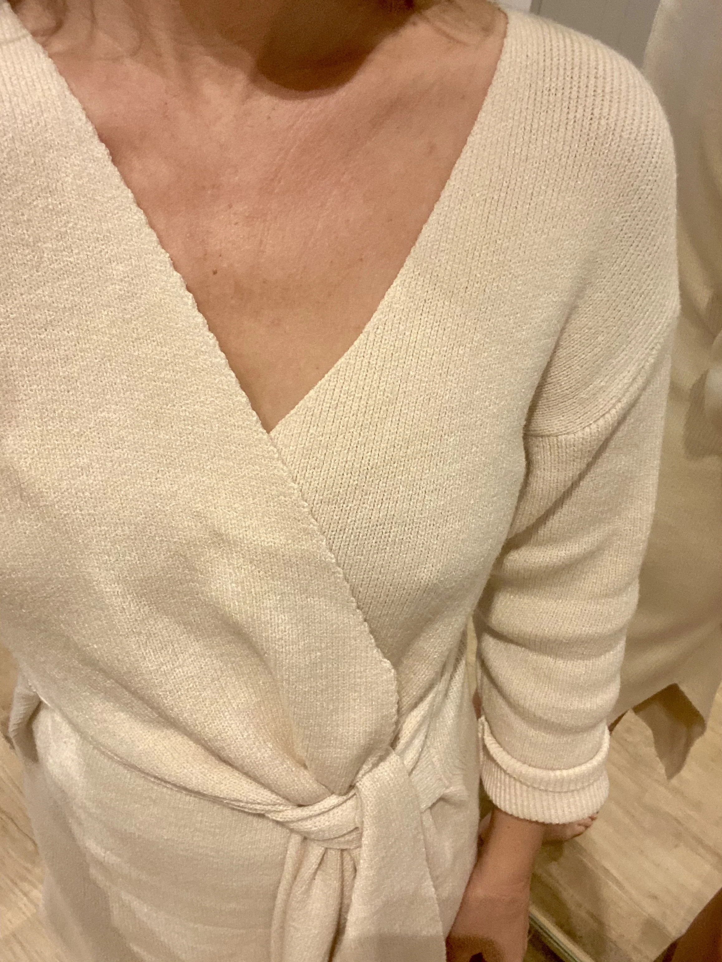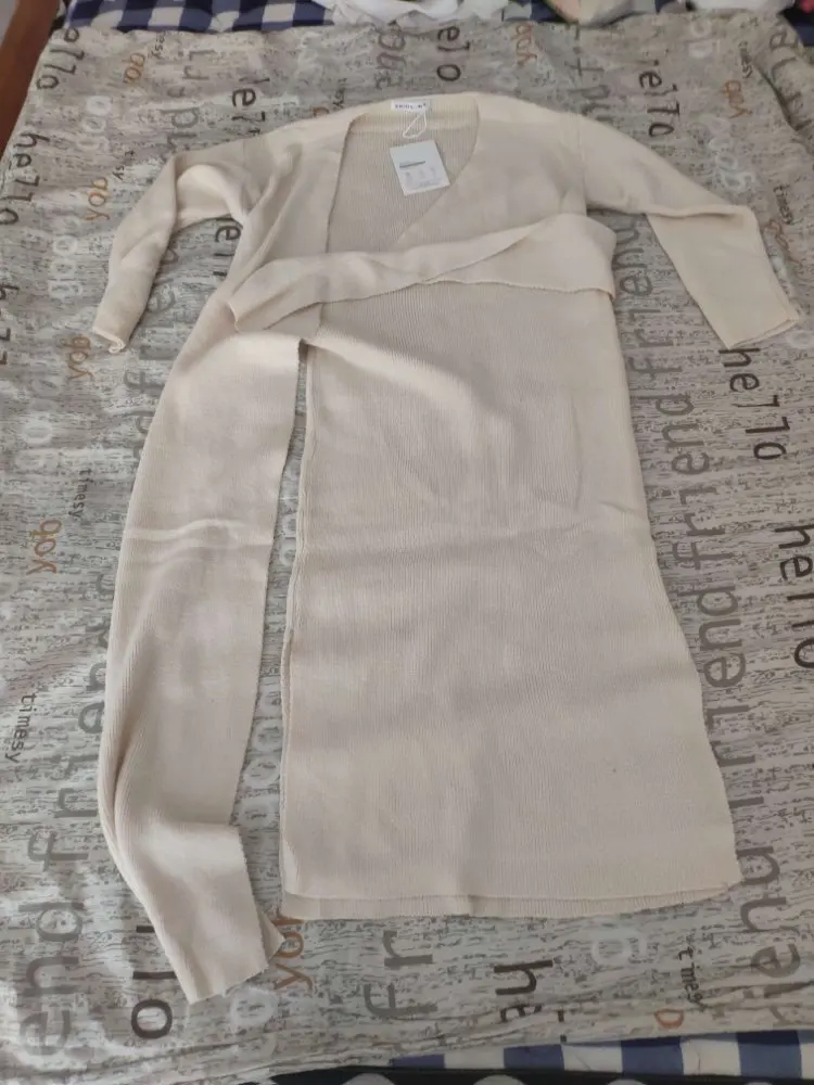 На фотографиях выглядит больше ангорской шерсти. В реальной жизни это более мягкий вискозный полиэстер. Цвет слоновой кости. Длина нормальная, но не до середины икры для меня. Мой рост 1,70 см. Я буду носить его, но в качестве домашней одежды не выходя.