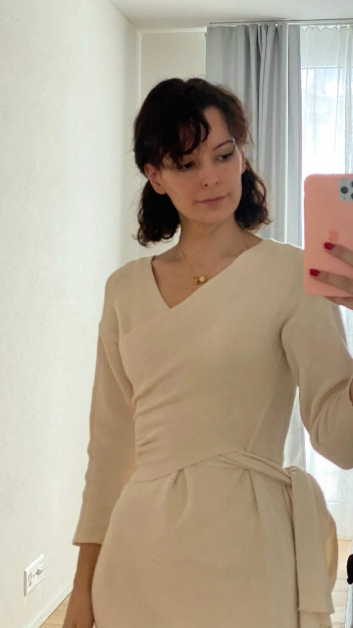 Очень красивая ткань, на наклейках указана 30% шерсть. Узел слишком тяжелый для меня, он тянет вниз и тянет платье с ним сбоку. Я хочу попробовать и увидеть широкий конец, чтобы он не открылся так широко, я думаю, что это может помочь.