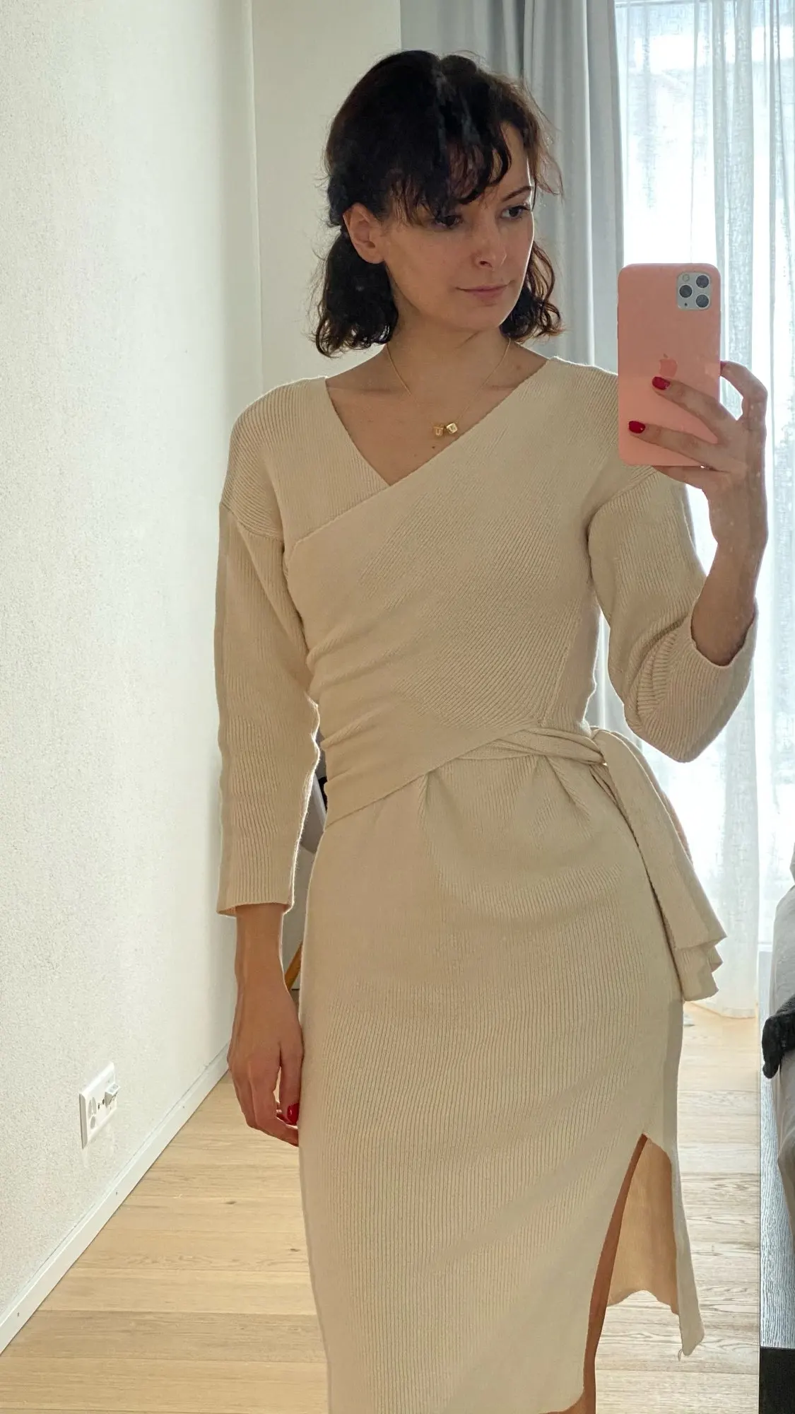 Очень крутое платье. Длинное на рост 166 . Тёплое и беж не просвечивает .