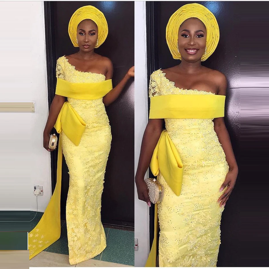 Элегантное желтое платье на одно плечо для выпускного вечера, кружевное официальное платье с аппликацией, арабское платье Aso Ebi, вечерние платья для Африканской вечеринки