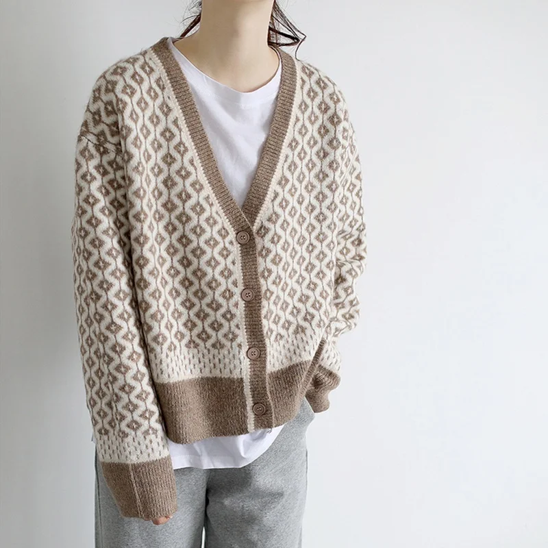 Женский вязаный кардиган с ромбиками, винтажный короткий свитер с V...