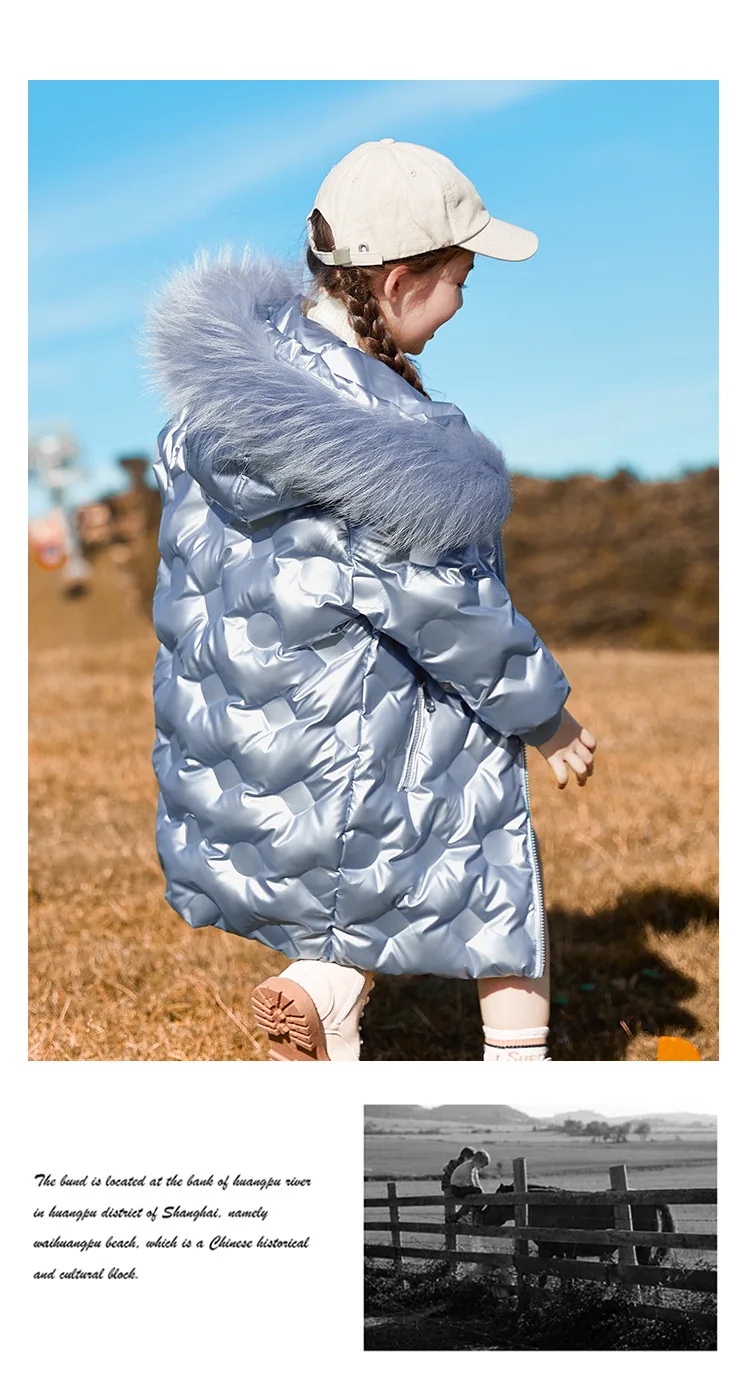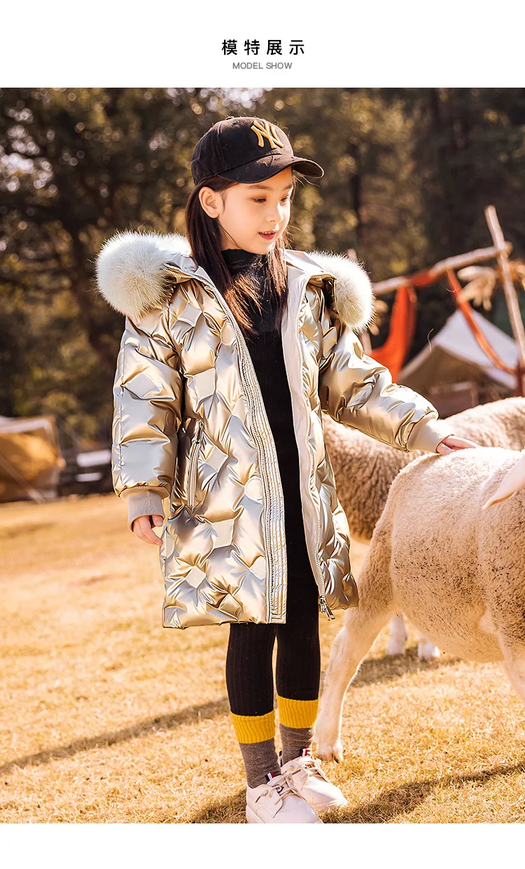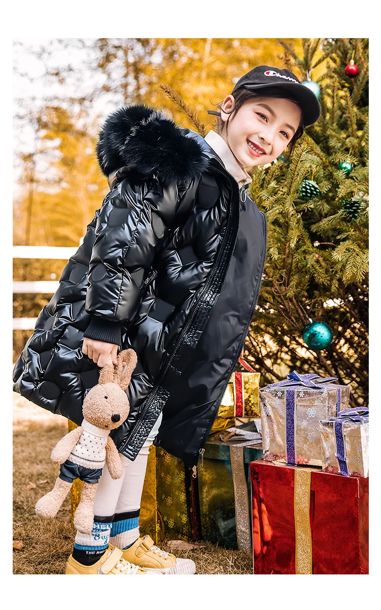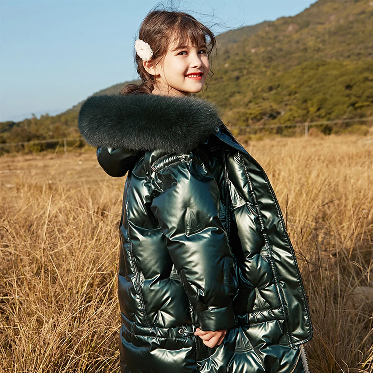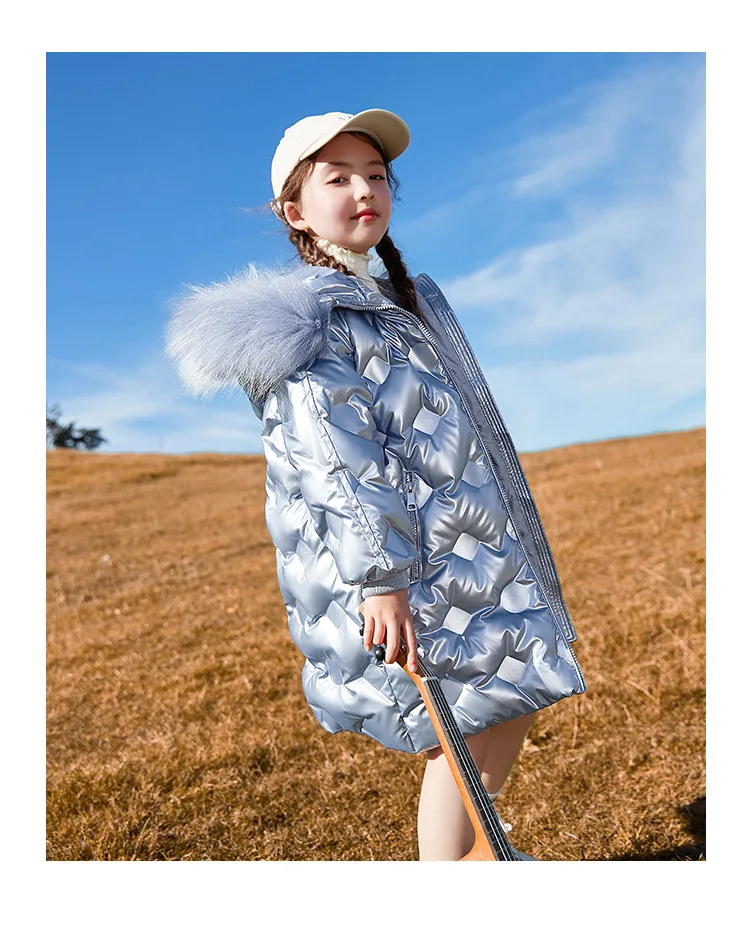 Зимний комбинезон; Одежда для девочек; Куртка-пуховик из водонепроницаемого материала; Блестящее пальто с капюшоном и большим мехом для девочек; Новинка 2022 года; Зимнее пальто для подростков
