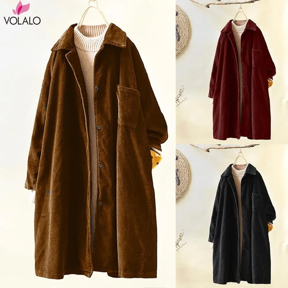 Куртка женская Вельветовая однотонная, винтажная теплая свободная повседневная куртка с карманами и рукавами на пуговицах, размера плюс, M-5XL, зима 2020