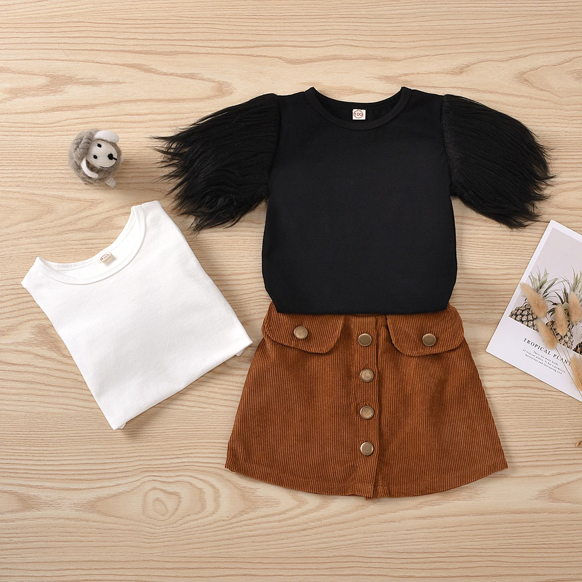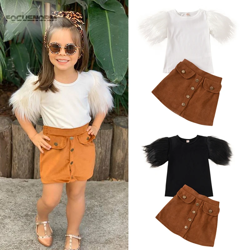 FOCUSNORMОт 2 до 8 лет; Модные комплекты одежды для маленьких девочек; Однотонные футболки с короткими рукавами и мехом; Топы; Юбки трапециевидной формы с пуговицами