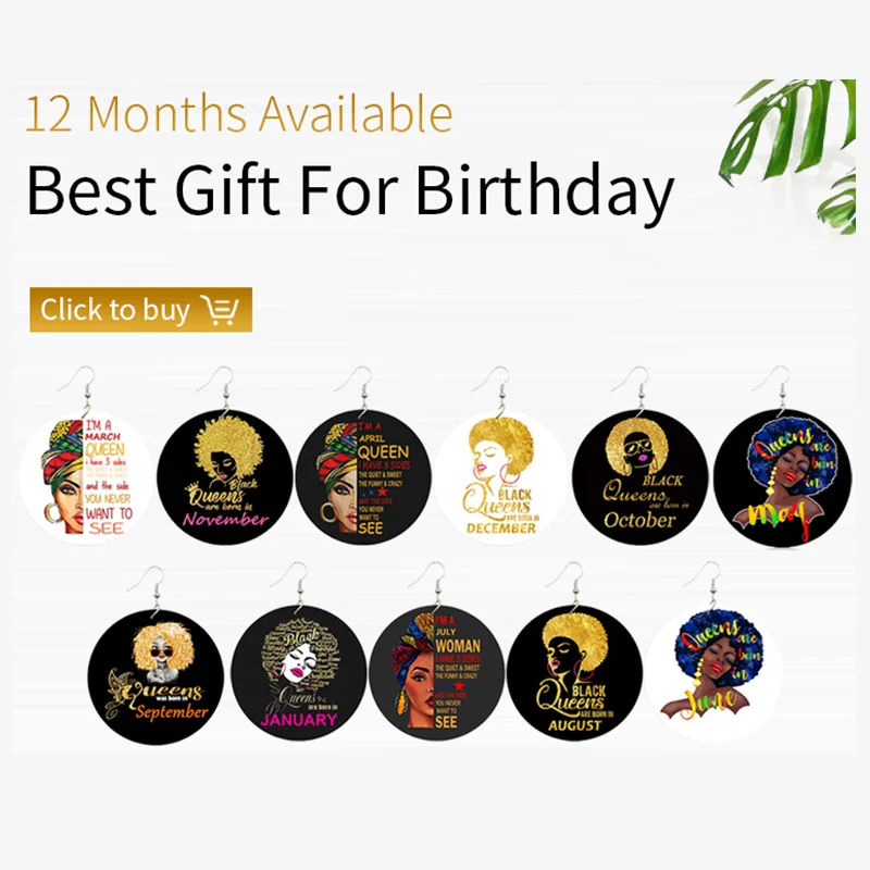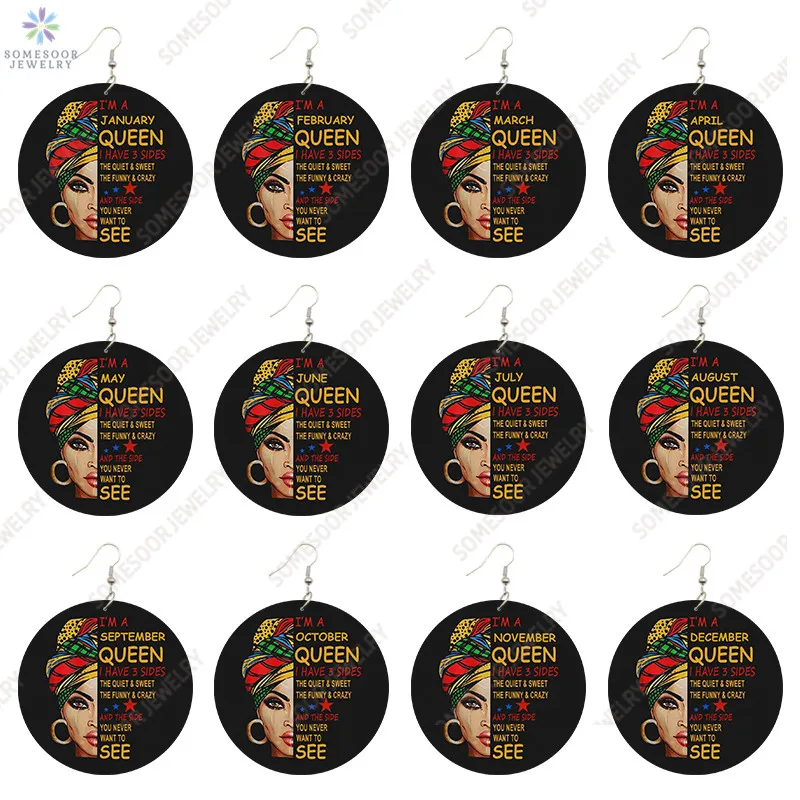 SOMESOOR 12 месяцев рождения печатные деревянные висячие серьги Черная Королева афро натуральные волосы дизайн петли Висячие для женщин Подарки 12 пар