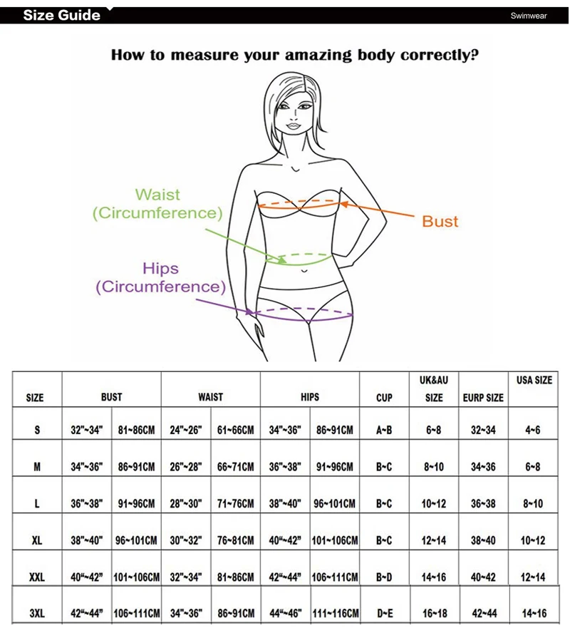 Как правильно измерить свое удивительное тело? -Бюст: Измерьте под руками, вокруг самой полной части груди. -Талия: Измерьте вокруг естественной талии, держа ленту немного свободной. -Бедра: Измерьте вокруг самой полной части вашего тела в верхней части ноги. После измерения объема груди, талии и бедер выберите аналогичный размер в соответствии со следующей таблицей размеров Дружеское напоминание Примечание 1: 1 дюйм = 2,54 см, 1 см = 0,39 дюйма, 1 Чи = 33,3333333 см Примечание 2: могут быть небольшие различия в цвете из-за настроек пикселей монитора компьютера Примечание 3: из-за разницы в способе измерения размеры могут отличаться на 1-2 см Если Вы не знаете какой размер Вам нужен, Вы можете оставить сообщение с измерениями объема талии и груди. Мы отправим вам правильный размер после размещения заказа