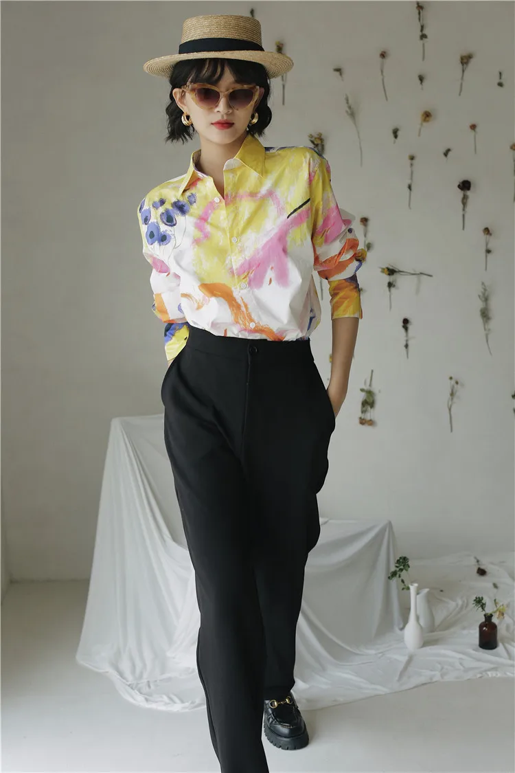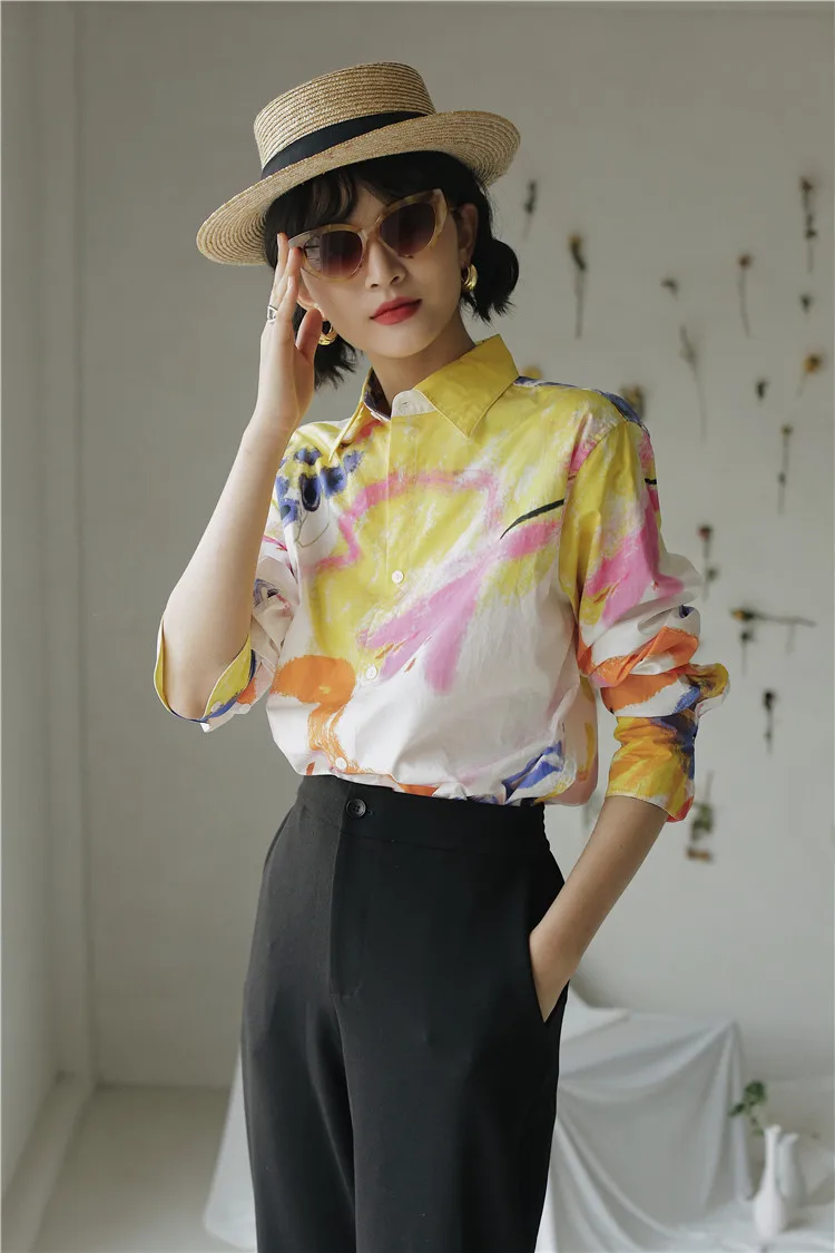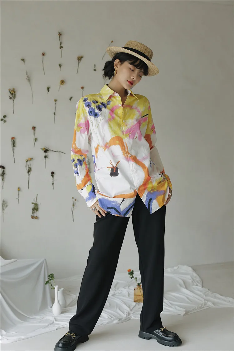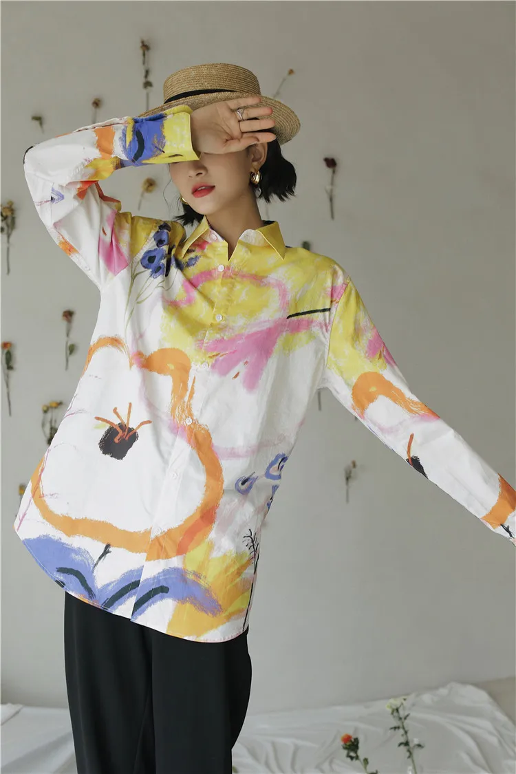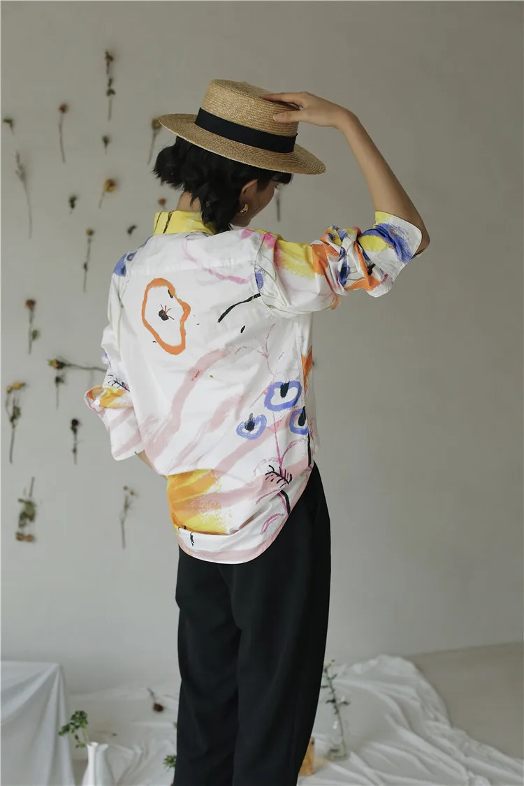 Дизайнерская Осенняя женская блузка CHEERART 2020, рубашка с длинным рукавом и воротником на пуговицах, белая хлопковая модная блузка с большим принтом, одежда