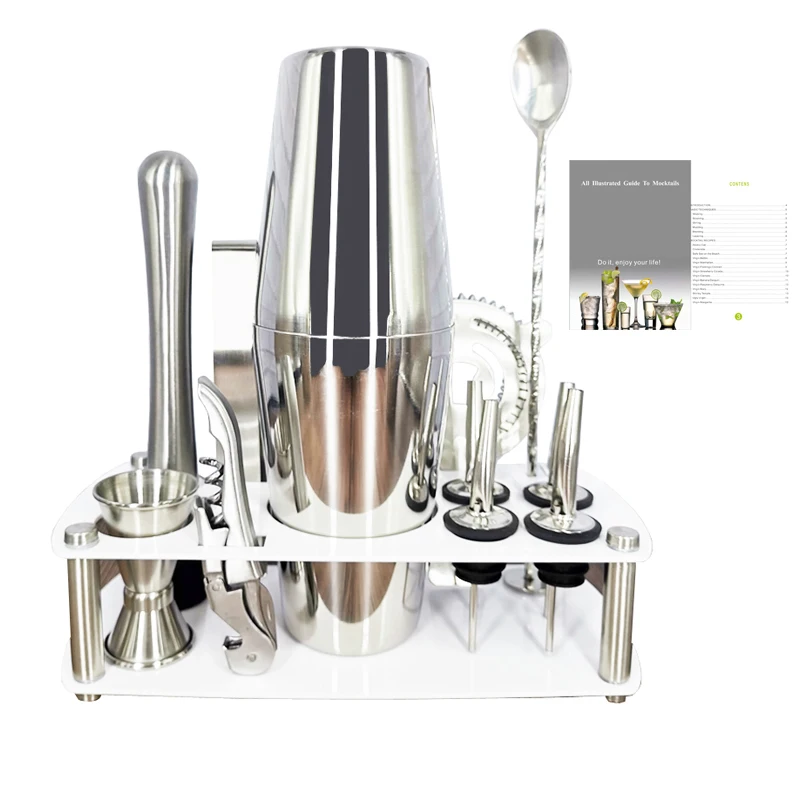 1 шейкер 750/600 мл, 1 ложка, 1 ситечко, 1 щипцы для льда, 1 ложка, 4 дозатора, 1 двухсторонний Джиггер 15/30 мл, 1 х канальный нож. 1 x стойка для белого вина.
