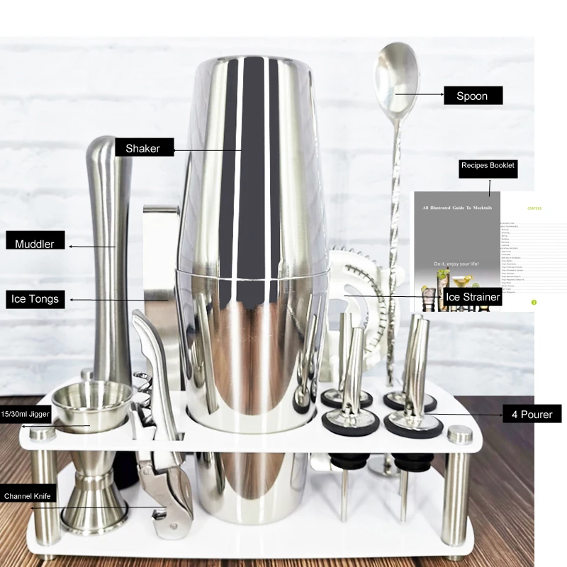 1 шейкер 450/600 мл, 1 ложка, 1 ситечко, 1 щипцы для льда, 1 ложка, 4 дозатора, 1 двухсторонний Джиггер 15/30 мл, 1 х канальный нож. 1 x стойка для белого вина.