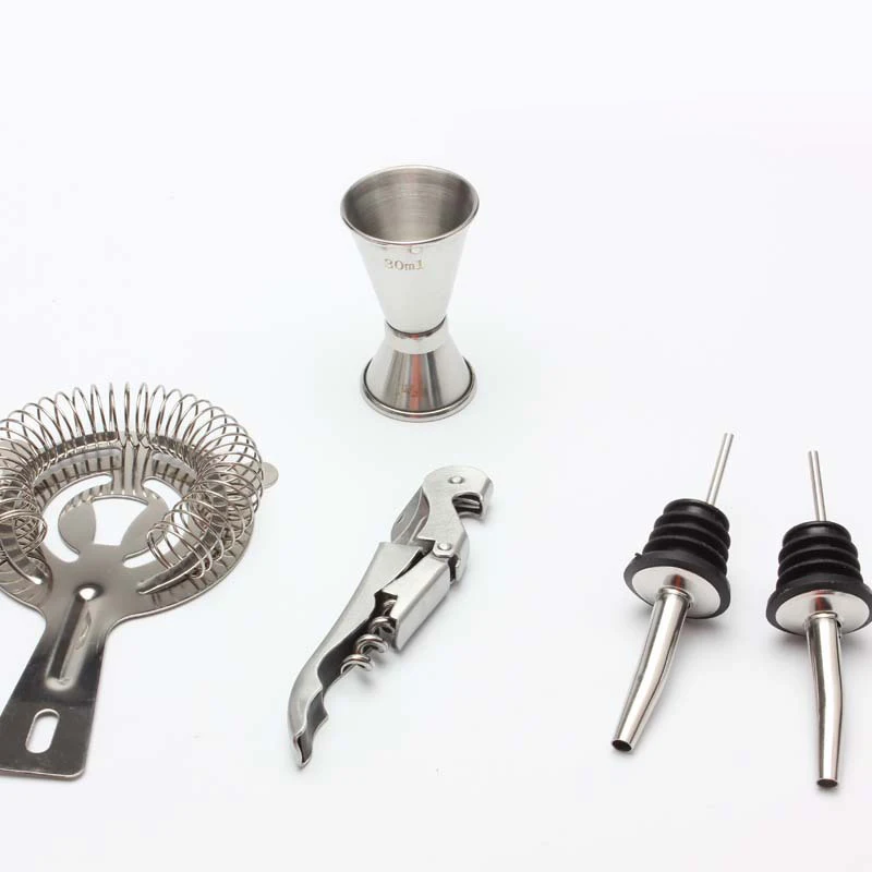 1 шейкер 750/600 мл, 1 ложка, 1 ситечко, 1 щипцы для льда, 1 ложка, 4 дозатора, 1 двухсторонний Джиггер 15/30 мл, 1 х канальный нож.