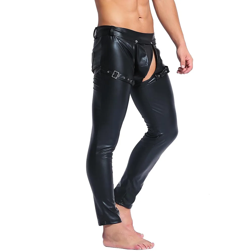 Сексуальные мужские обтягивающие брюки из искусственной кожи, Клубные леггинсы, брюки для ночного клуба, мужские длинные брюки из искусственной кожи черного цвета с открытой передней частью