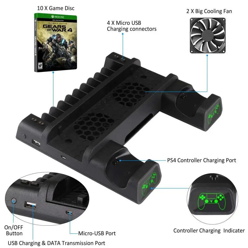 Вертикальная подставка для PS4PS4 SlimPS4 Pro, охлаждающий вентилятор со светодиодной подсветкой, зарядное устройство для двух контроллеров, зарядная станция для кулера SONY Playstation 4