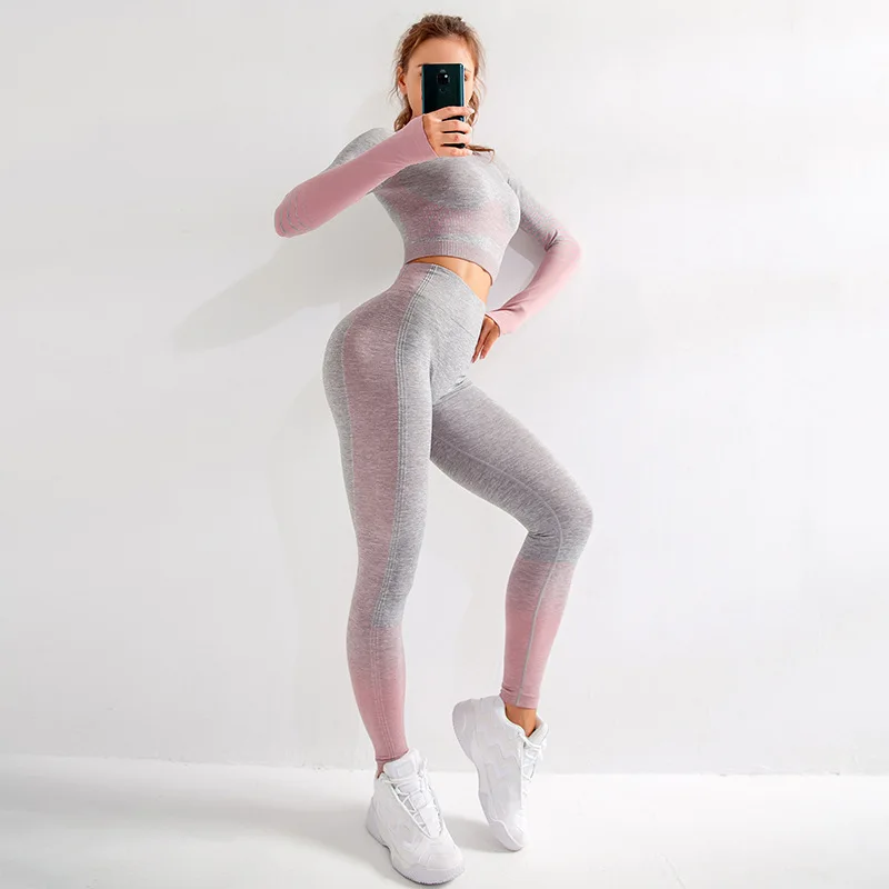 Женский комплект для йоги, бесшовный спортивный костюм для фитнеса, рубашка с длинным рукавом, леггинсы с высокой талией, полосатые штаны для йоги, костюм для бега и тренировок