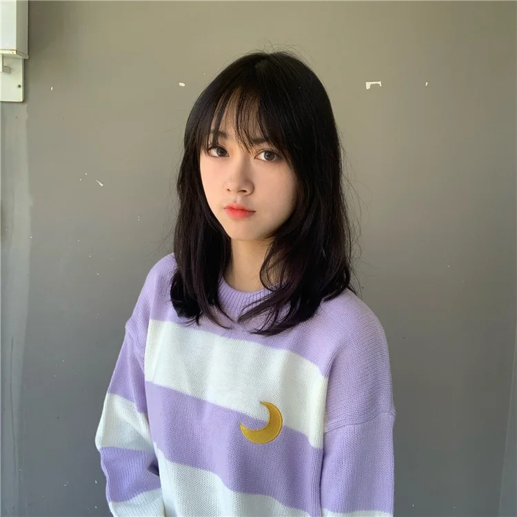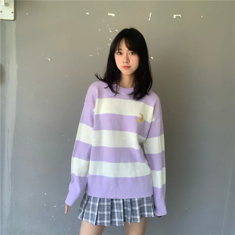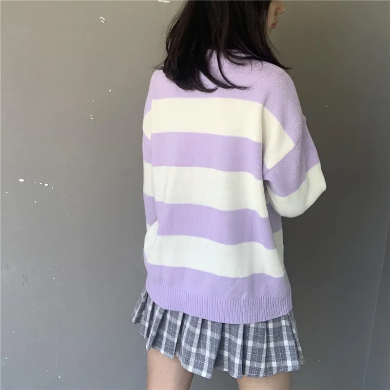 Милый женский свитер в стиле Харадзюку, Осенний фиолетовый вязаный джемпер в Корейском стиле, зимний Винтажный Розовый пуловер в полоску с длинным рукавом, Топ