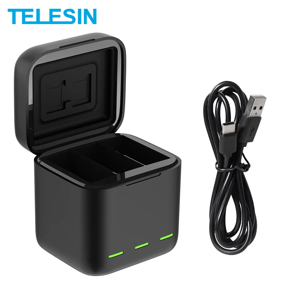 TELESIN-cargador de batera de 3 vas con luz LED, caja de carga para...
