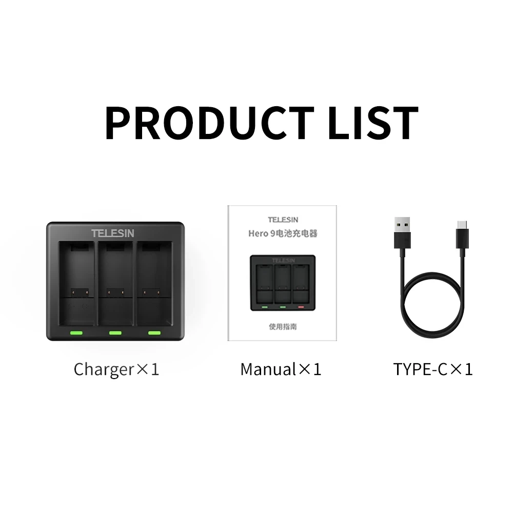 Зарядное устройство TELESIN для GoPro 9, зарядное устройство со светодиодной подсветильник кой, 3 режима, зарядка для карт памяти TF, для GoPro9, Hero9, GoPro10, GoPro Hero 10, 9, черный