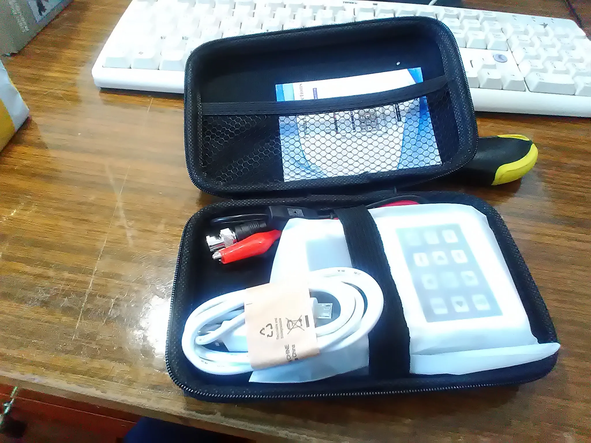 Вкратце: если думали брать- берите. Если более подробно, то вот: приехал быстро, в комплекте кейс, кабель питания/подключения, кабель на щуп. Честно, сразу заказал кабель получше, и вам советую не пожалеть 300-350 рублей и докупить нормальный щуп с делителем. Щуп в комплекте представляет из себя два крокодильчика, переходящие в коаксиал. По внутрянке: пробовал, что под руку попалось: шим от ардуины нано, показывает достаточно точно: нет возможности сейчас сравнить с поверенным осциллографом, чтобы оценить погрешность и линейность измерений, но для любительского использования вообще отлично. Я даже верю в полосу пропускания 5 мГц. Внутри ещё не все функции изучил, но уже точно нашёл собственный делитель, масштабирование и все такое, ориентирование по фронту сигнала. Огорчило одно: отсутствует возможность масштабировать сигнал при нажатии на паузу. Проблема очевидно софтовая и было бы здорово, если бы она была решена. По итогу: отличная вещь, особенно за такие деньги.